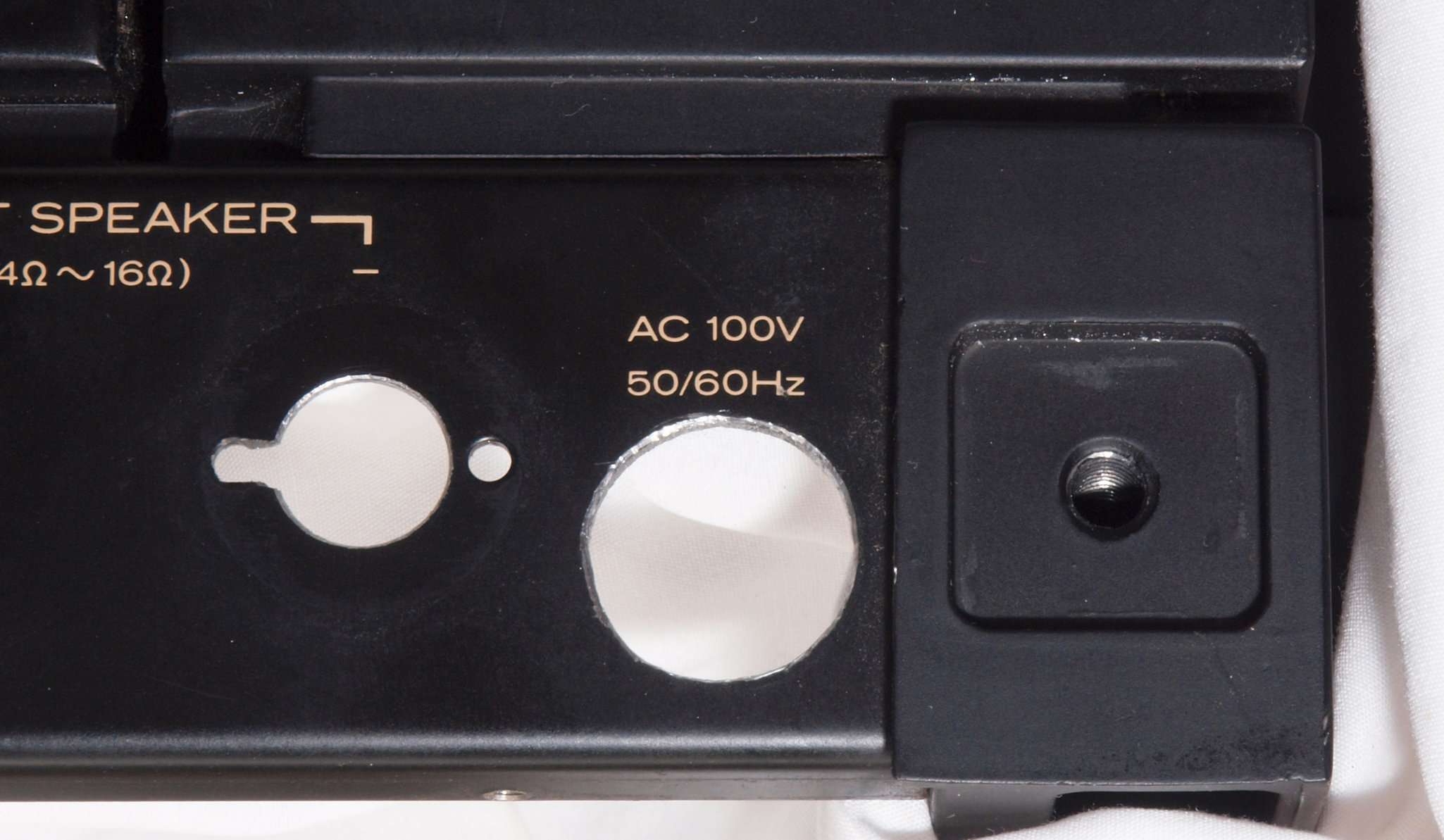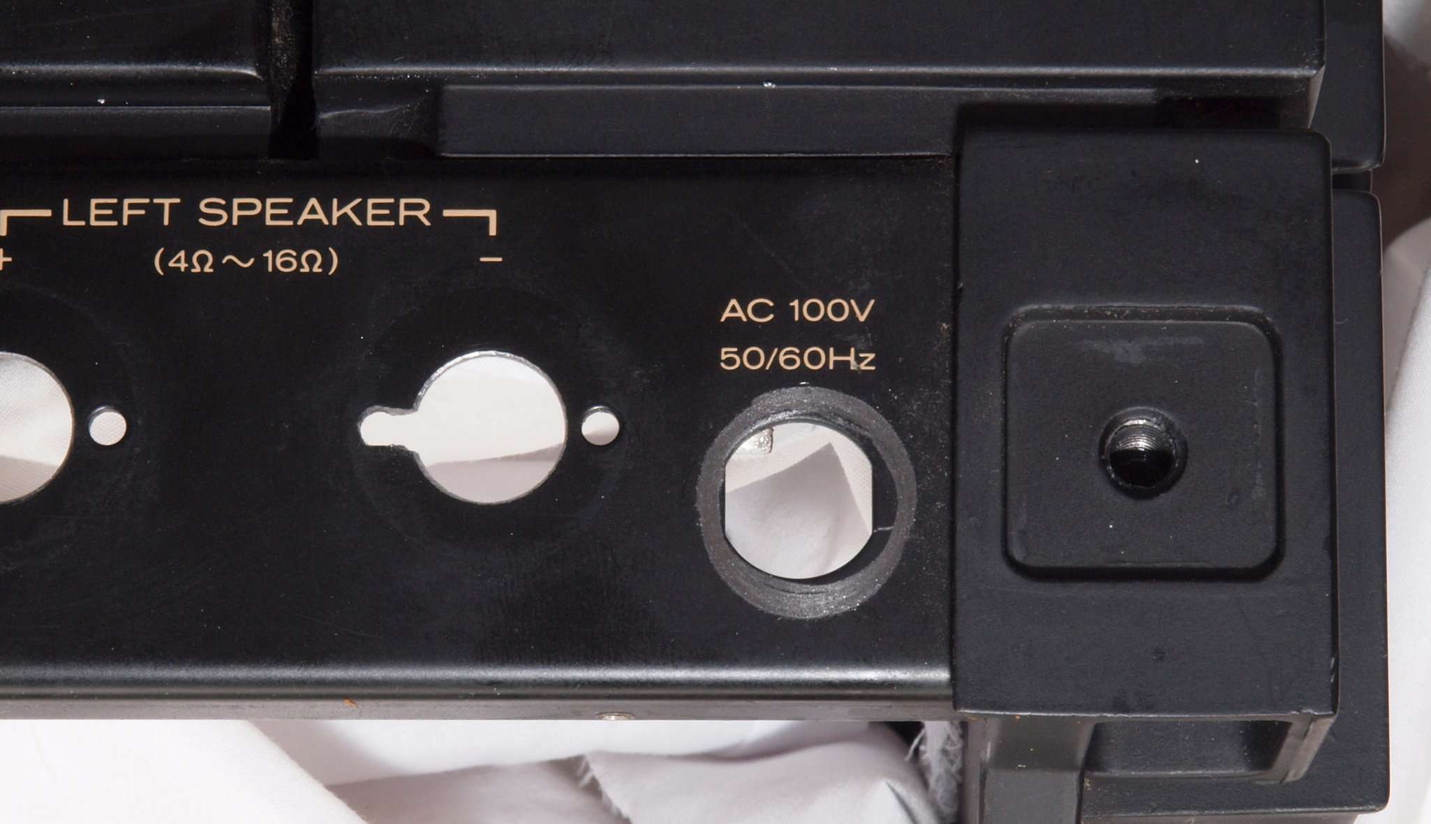 | C92. 修理中 電源ケーブル取り付け部穴加工前。 SP接続端子との距離を取る為に、下右方向へ広げる為、昔ながらのヤスリで削る。 |