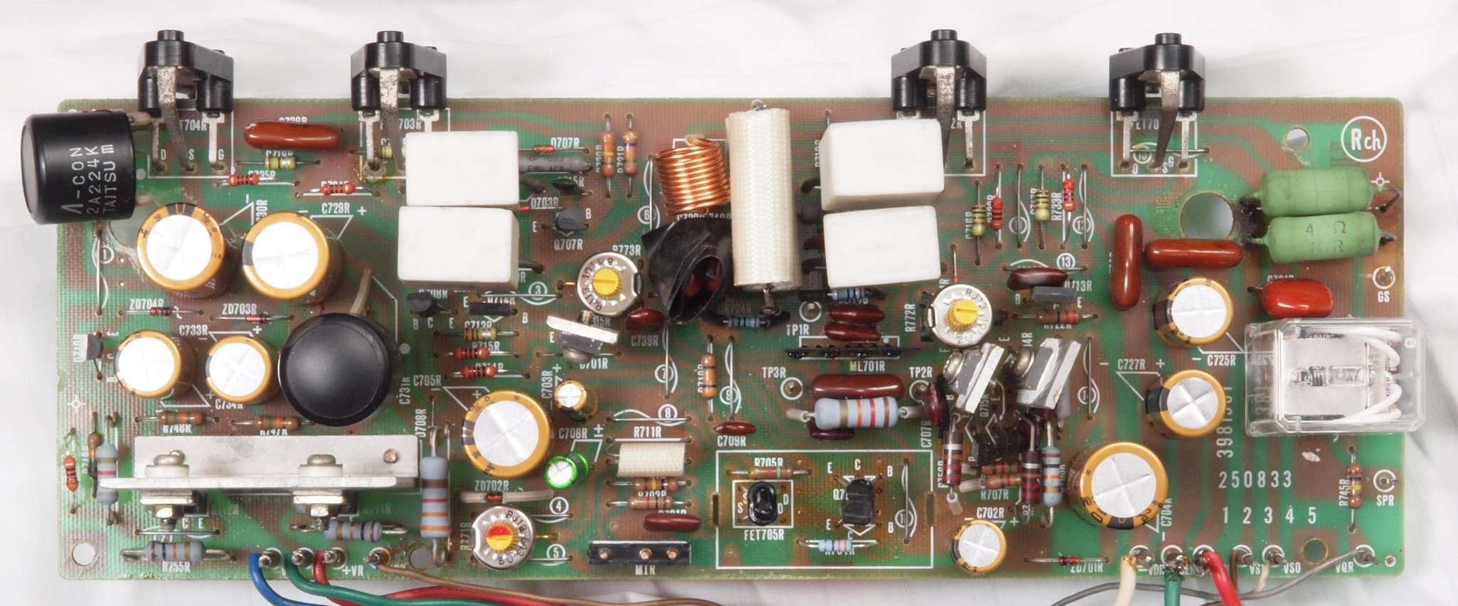 | C12. 修理後 R側ドライブ基板。 初段FET(電界効果トランジスター)、バランス・バイアス調整用半固定VR3個、SP接続リレー交換 ヒューズ入り抵抗全部、電解コンデンサー11個、足黒TR(トランジスター)6個交換。 |