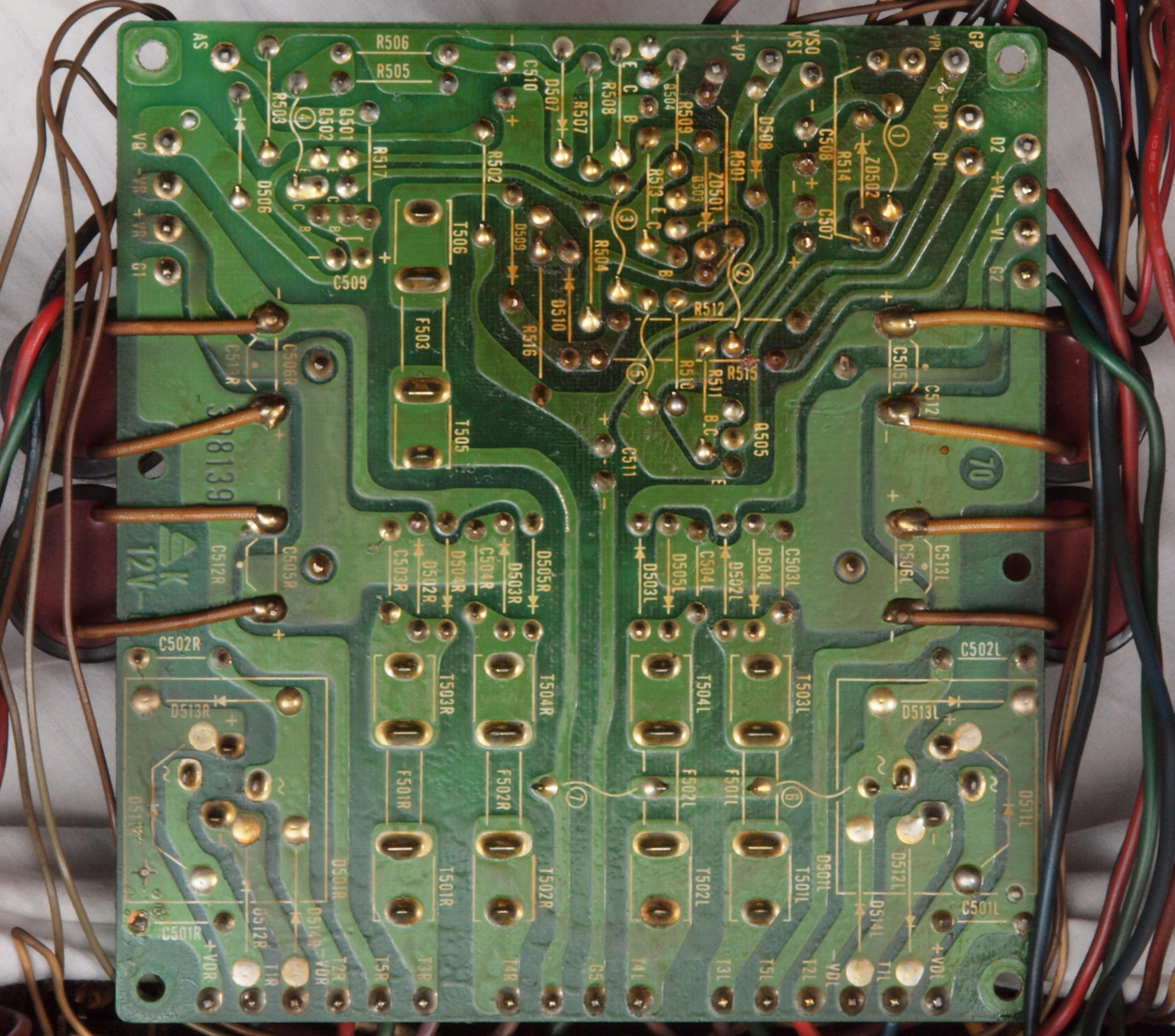 C43. 修理中 RLモジュール裏。 TR(トランジスター)6個交換し、洗浄後軽くラッカーを吹く。