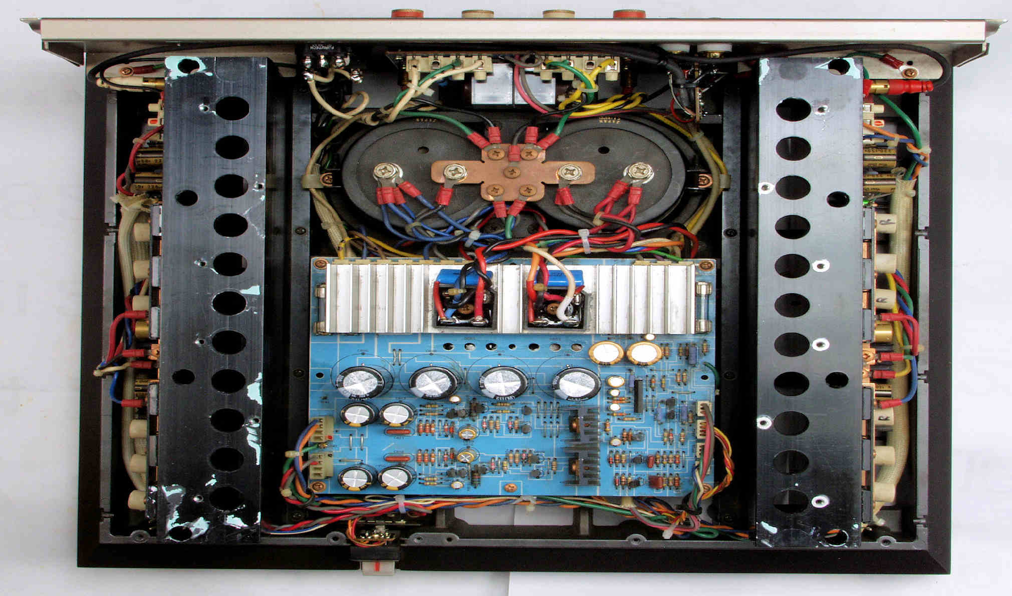 | A26. 点検中 右側終段アンプ基板の頭のビニールが後退した電解コンデンサー。 オーバーホールは「H*F*堂」で完了の事? |