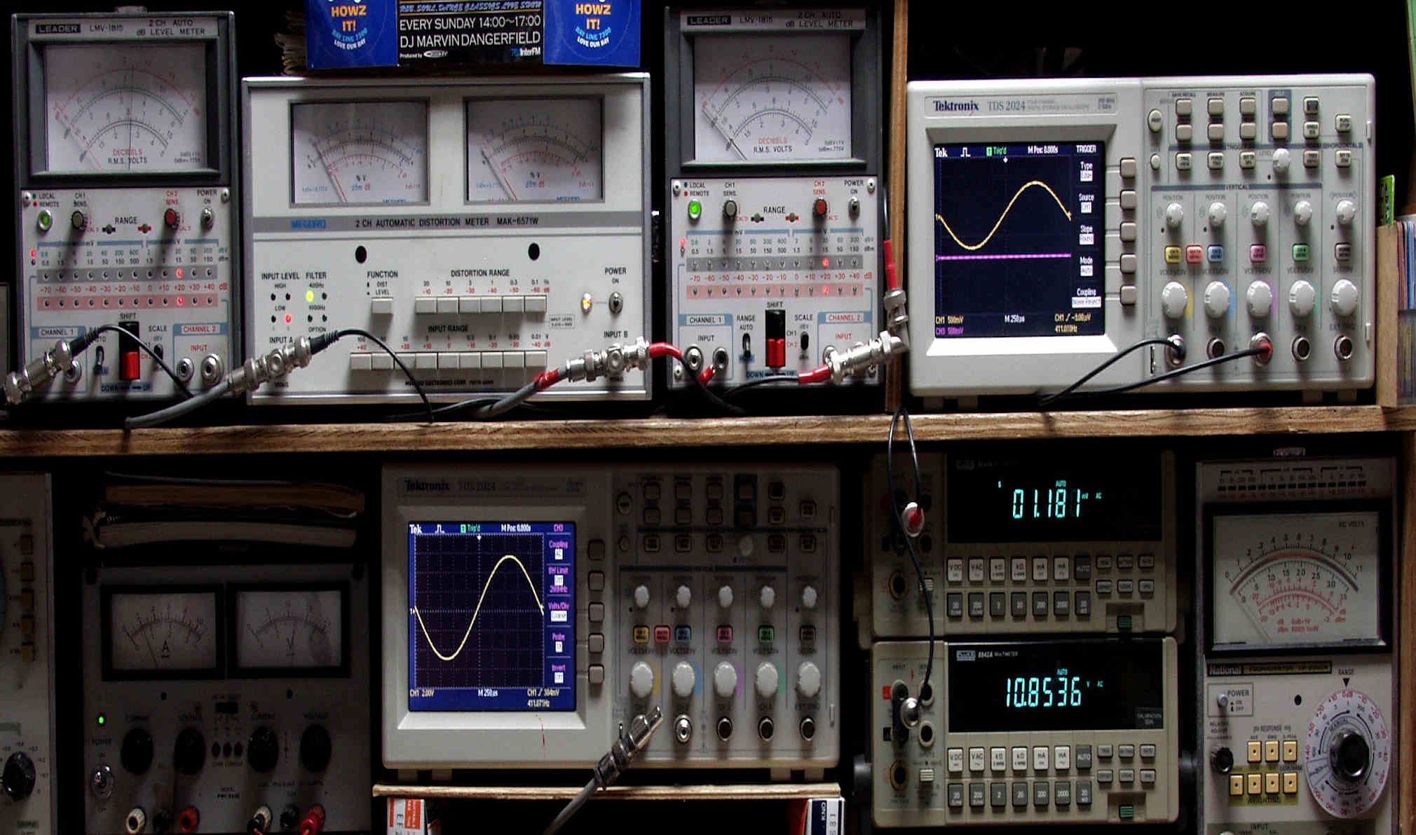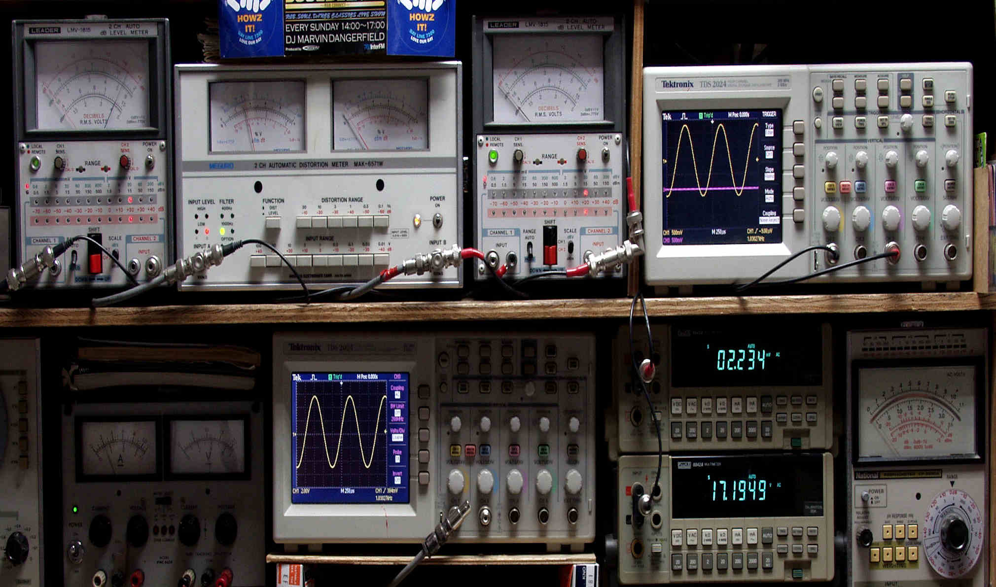| T. 修理前点検測定。 画像をクリックすると、大きく(横幅2050ドット)表示されます。 T0. 出力・歪み率測定。 「見方」。 下段左端 オーディオ発振器より400HZ・1KHZの信号を出し(歪み率=約0.003%)これをAMPに入力し、出力を測定。 下段中央 オシロ=入力波形(オーディオ発振器のTTLレベル表示)。 上段左端 交流電圧計=L側出力電圧測定、黒針のみ使用。 上段中左 歪み率計=出力の歪み率測定 左メータ=L出力、右メータ=R出力。 上段中右 交流電圧計=R側出力電圧測定、赤針のみ使用。 上段右端 オシロ=出力波形表示、 赤表示=R出力、黄色表示=L出力。(実際にはRL交流電圧計の出力「Max1V」を観測)。 下段中右上 デジタル電圧計=R出力電圧測定。 下段中右下 デジタル電圧計=L出力電圧測定。 |