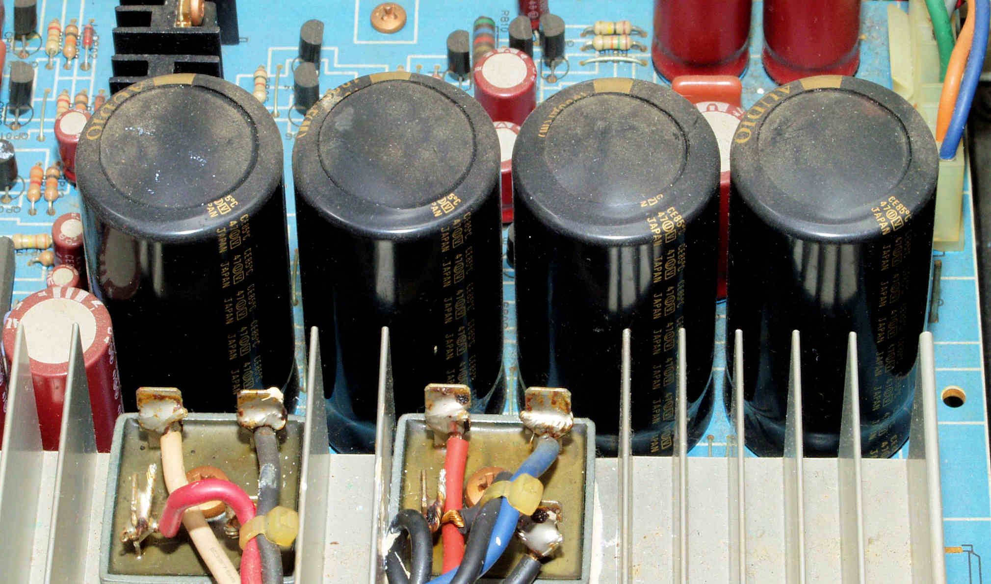 | A24. 点検中 右側終段アンプ基板の頭のビニールが後退した電解コンデンサー。 ユーザー言はく、オーバーホール修理は「H*F*堂」で完了の事?。 オーバーホール修理の修理内容は修理屋で非常に異なる。 |