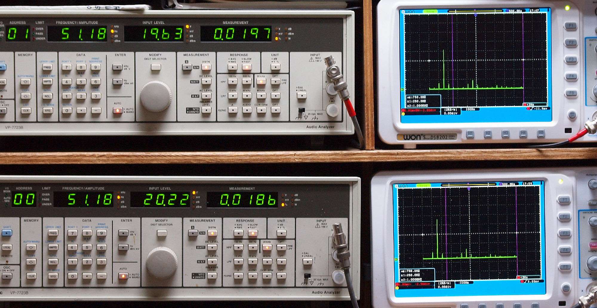 | E. 測定・調整。 画像をクリックすると、大きく(横幅2050ドット)表示されます。 E1. 出力・歪み率測定・調整 「見方」。 上段中 右側SP出力を「Audio Analyzer Panasonic VP−7723B」により測定。 表示LED、 左端=メモリーNo、 中左=周波数測定、 中右=出力電圧測定、 右端=歪み率測定。 上段右端 VP−7723Bの基本波除去出力を「owon SDS8202(200MHZ)」で「FFT分析」表示。 下段中 左側SP出力を「Audio Analyzer Panasonic VP−7723B」により測定。 表示LED、 左端=メモリーNo、 中左=周波数測定、 中右=出力電圧測定、 右端=歪み率測定。 下段右端 VP−7723Bの基本波除去出力を「owon SDS6062(200MHZ)」で「FFT分析」表示。 下段左端 オーディオ発振器 VP−7201A より50Hz〜100kHzの信号を出し(歪み率=約0.003%)、ATT+分配器を通し、AMPに入力。 よって、ダイアル設定出力レベルより低くなります。測定機器の仕様や整備の様子はこちら、「VP−7723B」「VP−7201A」。 FFT画面の見方はこちら。 |