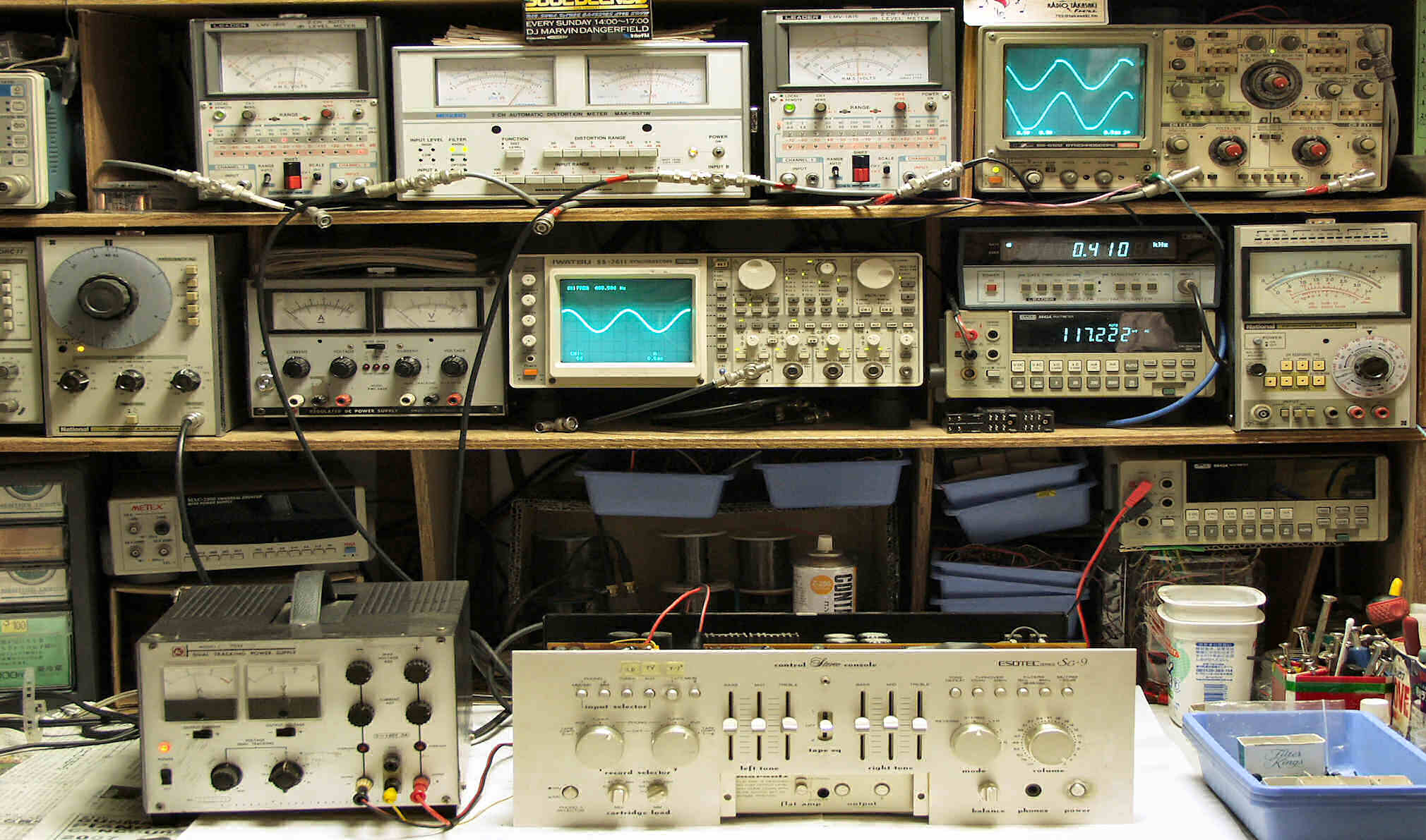 | AE. バラック修理で測定 電源トランス焼損なので、外部より電圧供給する AE1. 出力/歪み率測定・調整 <見方> 下段左端 オーディオ発振器より400HZ・1KHZの信号を出し(歪み率=約0.003%)これをAMPに入力し、出力を測定 下段中左 オシロ=入力波形(オーディオ発振器のTTLレベル) 下段中右上=周波数計 上段左端 電圧計=L側出力電圧測定、黒針のみ使用 上段中左 歪み率計=出力の歪み率測定 左メータ=L出力、右メータ=R出力 上段中右 電圧計=R側出力電圧測定、赤針のみ使用 上段右端 オシロ=出力波形 上=R出力、下=L出力(実際にはRL電圧計の出力「Max=1V」を観測) 下段中右上 デジタル電圧計=出力電圧測定RLは切り替えて測定 |