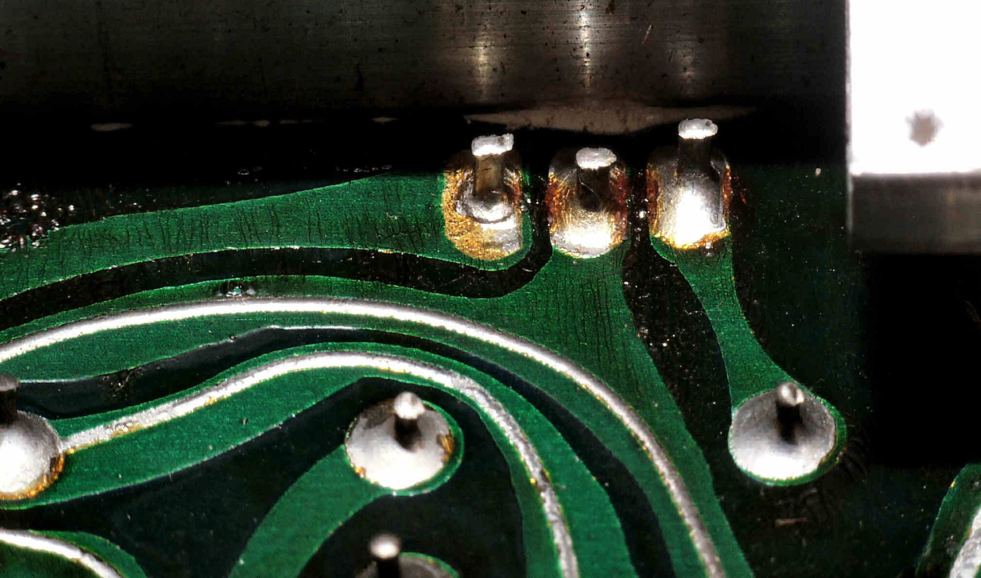 | C2A1. 修理後 HeadPhoneAMP基板 接着剤により腐食したTR(トランジスター)の足、真ん中の1本は断線。 | ||||||||||||||||||||