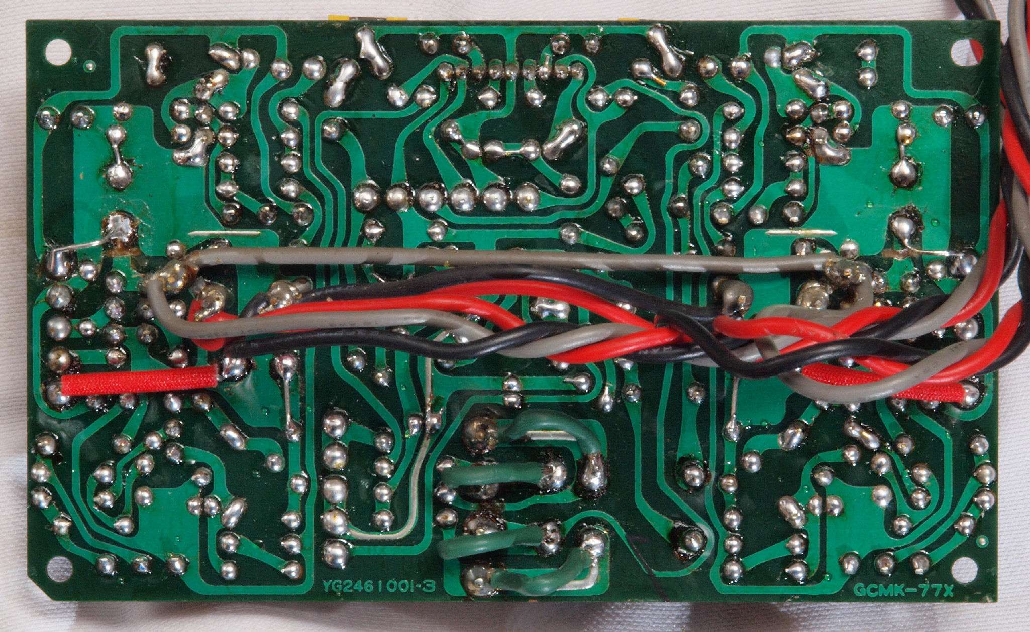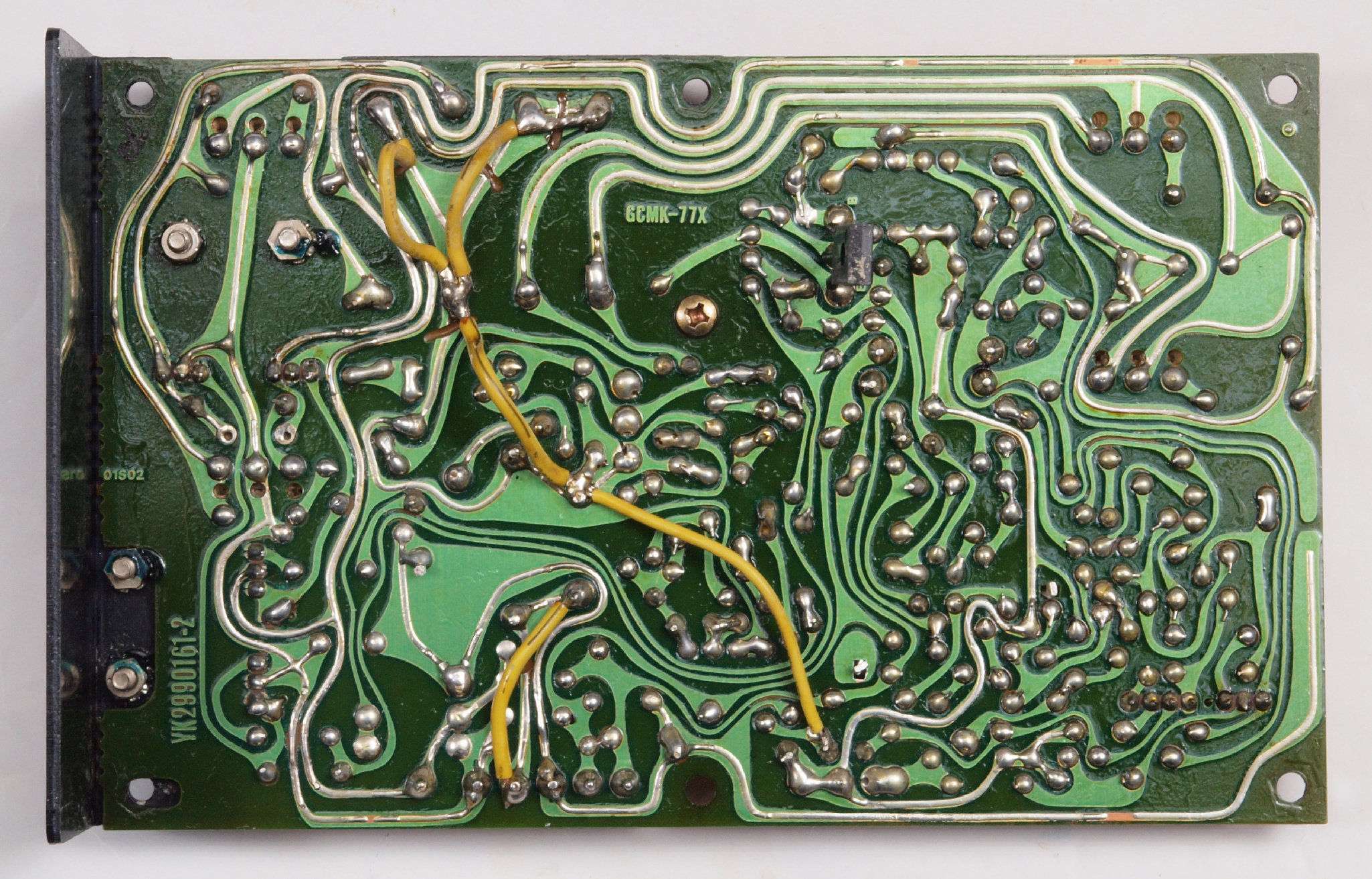 | C512. 修理中 定電圧・プロテクト基板。電解コンデンサー固定用の接着材、当時は溶媒にトルエンが使用されており、銅を腐食する。 | ||||||||||||||||||||||||
