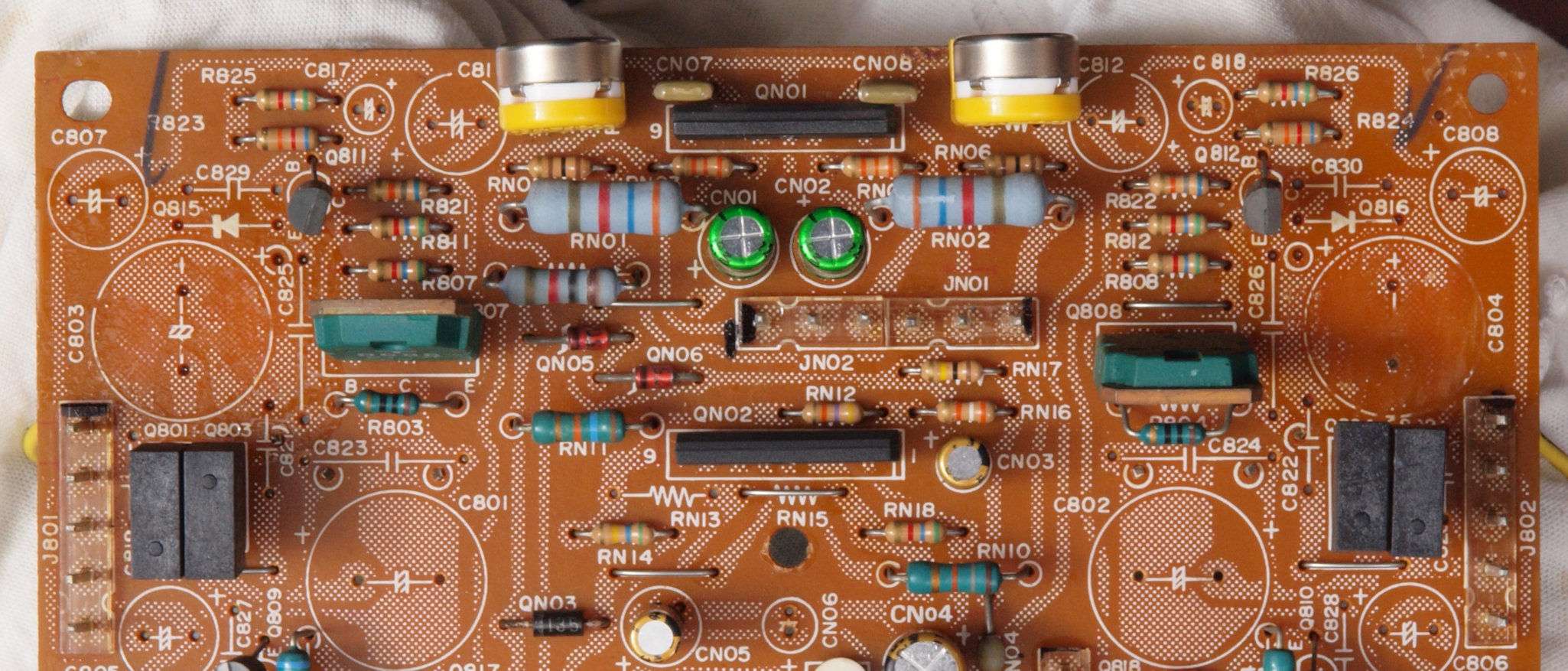 | C214. 修理中 R側終段基板。 焼損した抵抗。 | ||||||||||||||||||||||||