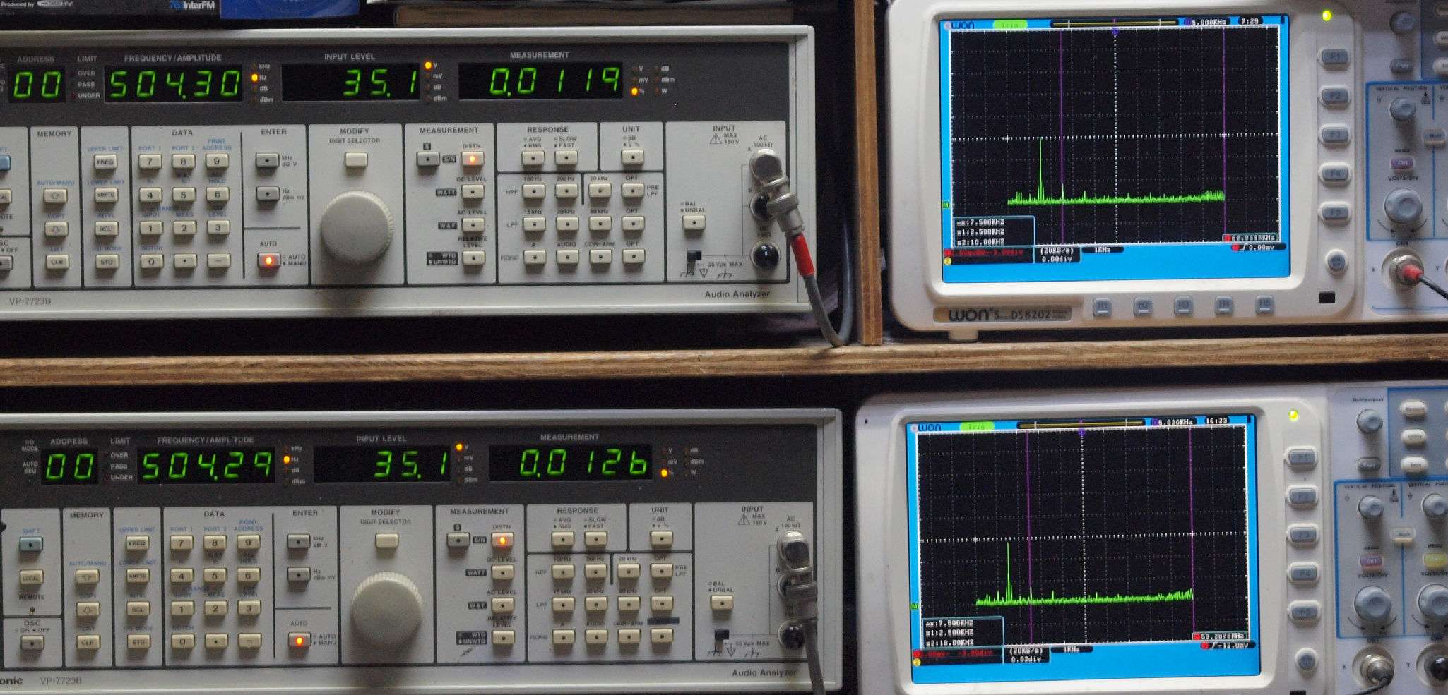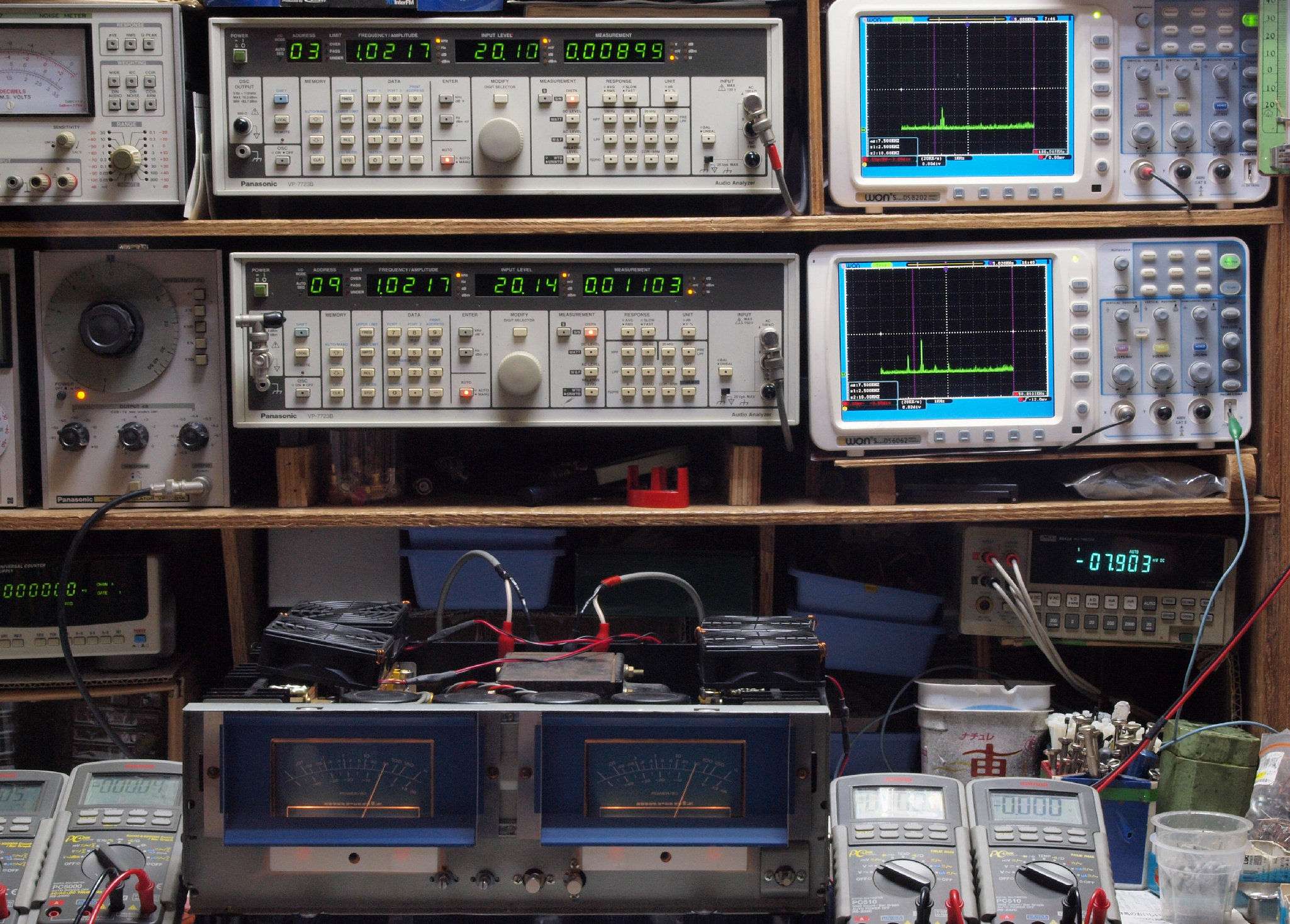 | E. 調整・測定。 画像をクリックすると、大きく(横幅2050ドット)表示されます。 E0. 出力・歪み率測定・調整。 「見方」。 上段中 右側SP出力を「Audio Analyzer Panasonic VP−7723B」により測定。 表示LED、 左端=メモリーNo、 中左=周波数測定、 中右=出力電圧測定、 右端=歪み率測定。 上段右端 VP−7723Bの基本波除去出力を「owon SDS8202(200MHZ)」で「FFT分析」表示。 下段中 左側SP出力を「Audio Analyzer Panasonic VP−7723B」により測定。 表示LED、 左端=メモリーNo、 中左=周波数測定、 中右=出力電圧測定、 右端=歪み率測定。 下段右端 VP−7723Bの基本波除去出力を「owon SDS6062(200MHZ)」で「FFT分析」表示。 下段左端 オーディオ発振器 VP−7201A より50Hz〜100kHzの信号を出し(歪み率=約0.003%)、ATT+分配器を通し、AMPに入力。 よって、ダイアル設定出力レベルより低くなります。測定機器の仕様や整備の様子はこちら、「VP−7723B」「VP−7201A」。 FFT画面の見方はこちら。 |