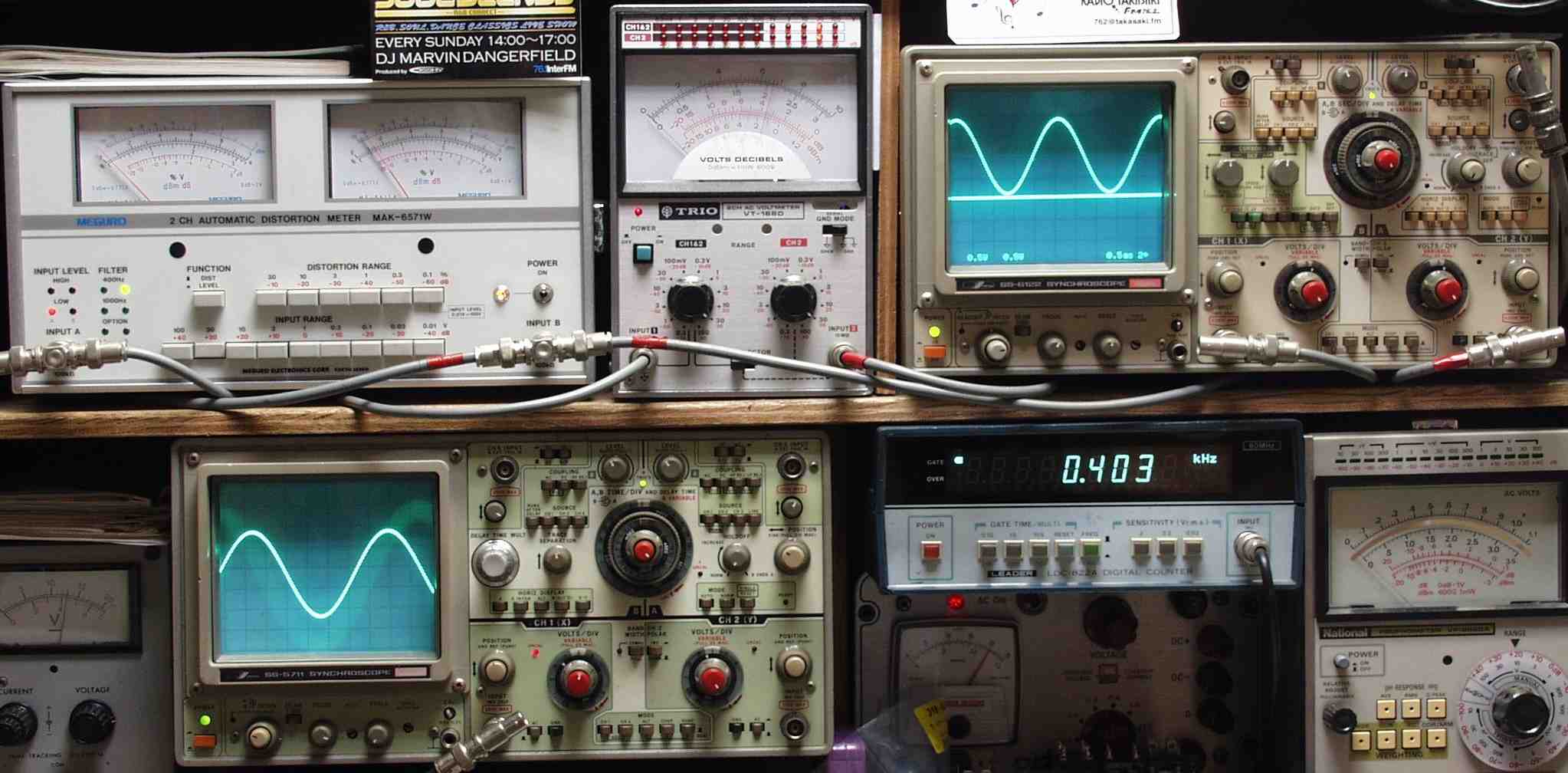 | E. 調整・測定 E1A. 出力・歪み率測定・調整 <見方> 下左オーディオ発振器より400HZ・1KHZの信号を出す(歪み率=約0.003%) 下中=入力波形(オーディオ発振器のTTLレベル) 下右=周波数計 上左=SP出力の歪み率測定 左メータ=L出力、右メータ=R出力 上中=SP出力電圧測定器、赤針=R出力、黒針=L出力 上右=SP出力波形オシロ 上=R出力、下=L出力(出力電圧測定器の出力) |