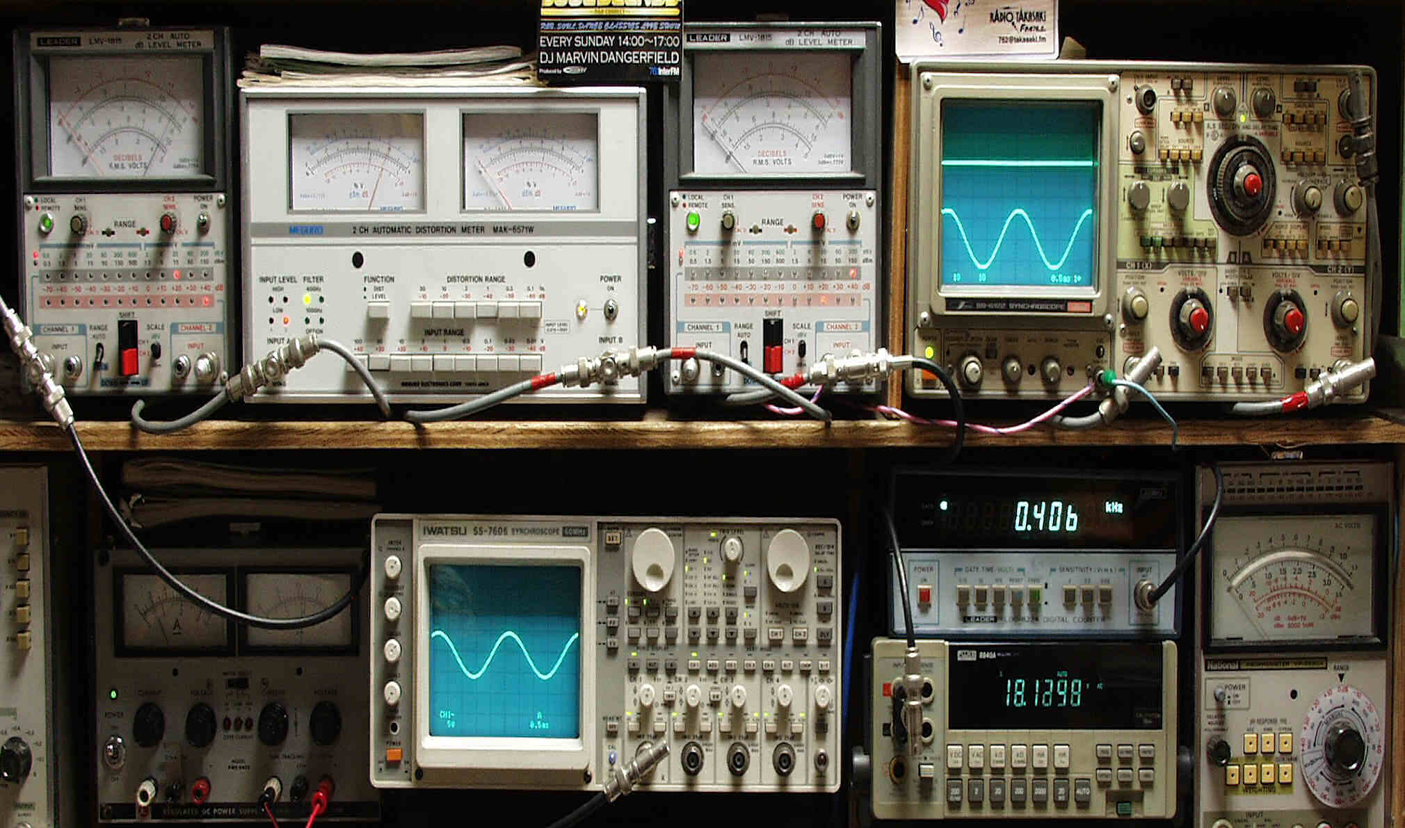 | T. 修理前点検測定 T1. 出力・歪み率測定 <見方> 下左オーディオ発振器より400HZ・1KHZの信号を出し(歪み率=約0.003%)これをAMPに入力し、SPからの出力を測定 下中オシロ=入力波形(オーディオ発振器のTTLレベル) 下中右上=周波数計 下中右下デジタル電圧計=SP出力電圧測定RLは切り替えて測定 上左端電圧計=L側SP出力電圧測定、黒針のみ使用 上中左歪み率計=SP出力の歪み率測定 左メータ=L出力、右メータ=R出力 上中右=R側SP出力電圧測定、赤針のみ使用 上右端オシロ=SP出力波形 上=R出力、下=L出力 |