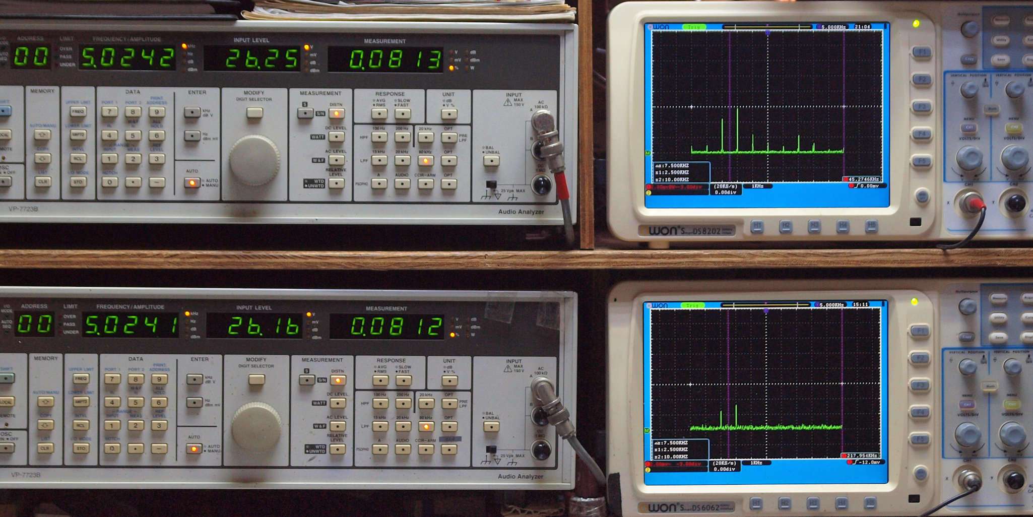 | E. 測定・調整。 画像をクリックすると、大きく(横幅2050ドット)表示されます。 E0. 出力・歪み率測定・調整 「見方」。 上段中 右側SP出力を「Audio Analyzer Panasonic VP−7723B」により測定。 表示LED、 左端=メモリーNo、 中左=周波数測定、 中右=出力電圧測定、 右端=歪み率測定。 上段右端 VP−7723Bの基本波除去出力を「owon SDS8202(200MHZ)」で「FFT分析」表示。 下段中 左側SP出力を「Audio Analyzer Panasonic VP−7723B」により測定。 表示LED、 左端=メモリーNo、 中左=周波数測定、 中右=出力電圧測定、 右端=歪み率測定。 下段右端 VP−7723Bの基本波除去出力を「owon SDS6062(200MHZ)」で「FFT分析」表示。 下段左端 オーディオ発振器 VP−7201A より50Hz〜100kHzの信号を出し(歪み率=約0.003%)、ATT+分配器を通し、AMPに入力。 よって、ダイアル設定出力レベルより低くなります。測定機器の仕様や整備の様子はこちら、「VP−7723B」「VP−7201A」。 FFT画面の見方はこちら。 入出力点検確認。 ライン1のアナログ入力、ライン2のバランス入力 、ライン出力点検確認済み。 デジタルNo1のST入力、デジタルNo2のBNCケーブル入力、デジタルNo3のRCAケーブル入力点検確認済み。 デジタルNo4の光ケーブル入力、デジタルNo5のSACD/1ビット入力(RCA入力)点検確認済み。 80kHz前後にクロック漏れが200mVPP(10mVrms)位あり、80kHzのローパスフイルターを挿入して測定。 仕様では、0.05%(1kHz、1W出力時) |