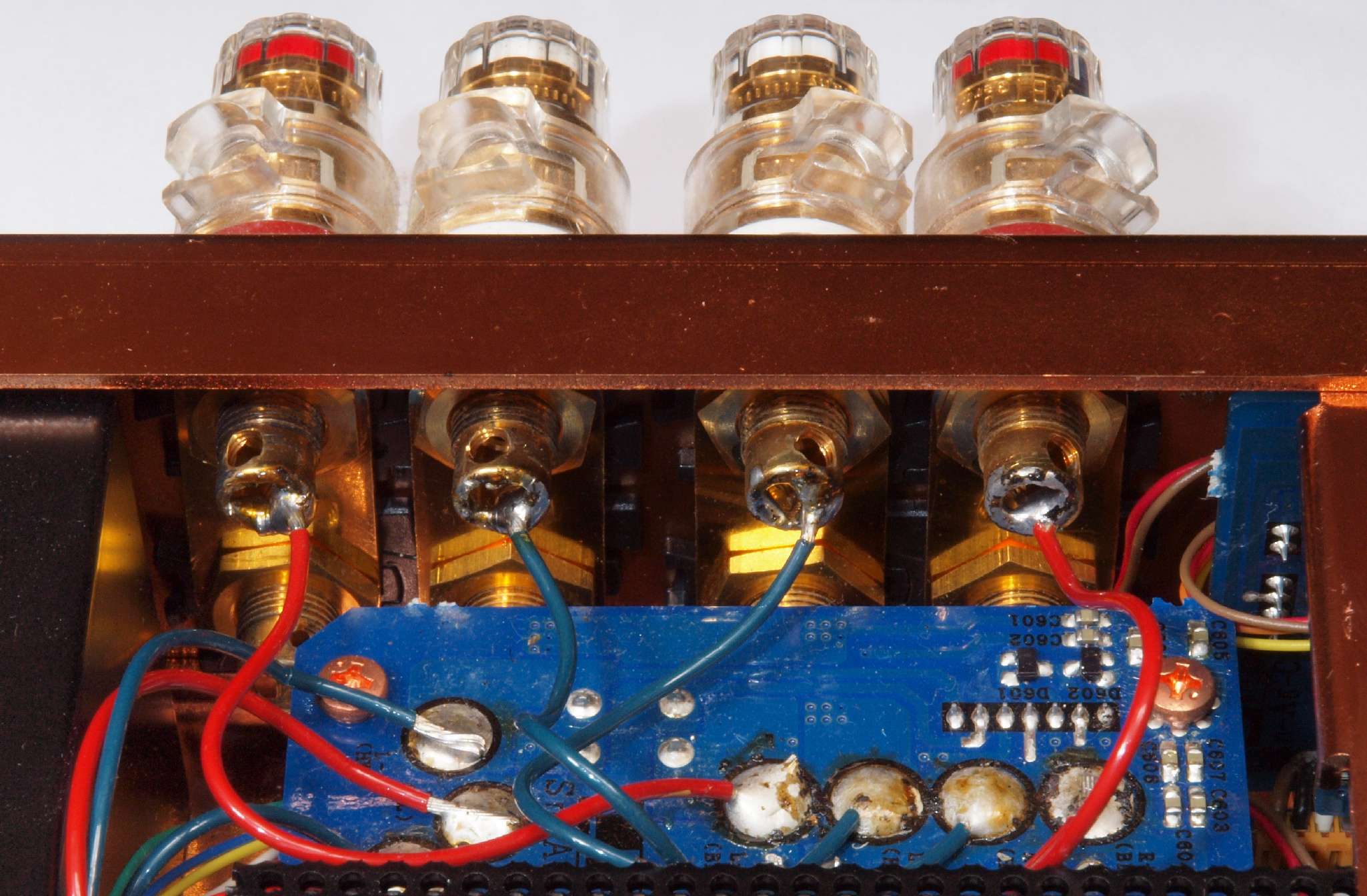 | C51. 修理中 SP接続リレー基板。 リレー定格電流5Aなので、5A×5A×4Ω=200W。4オーム出力の時はバイワイヤーが良い。 | ||||||||||||||||||||||||||||