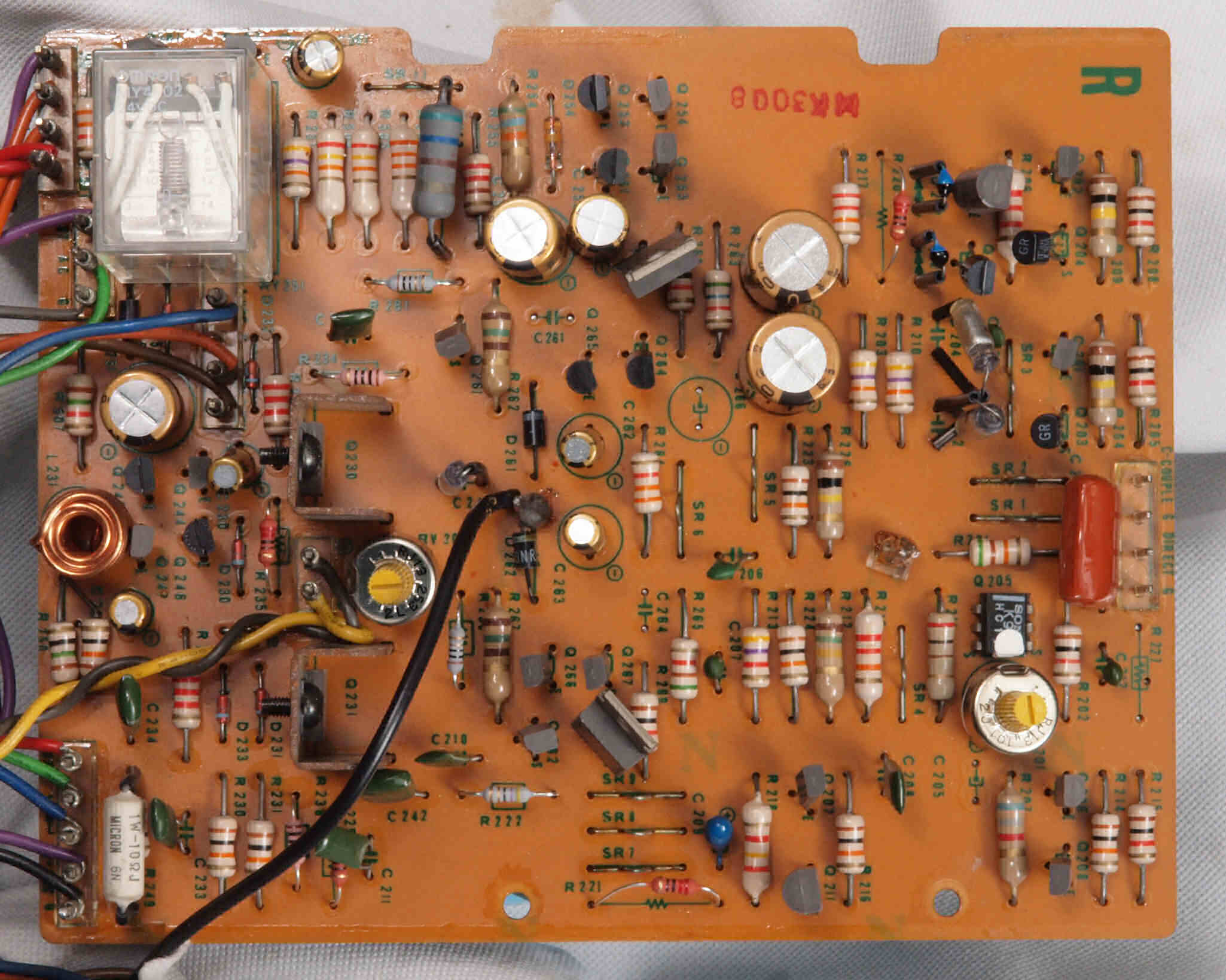 C72. 修理後 R側アンプ基板。 リレー1個、TR(トランジスター)4個、半固定VR2個、電解コンデンサー10個交換。
