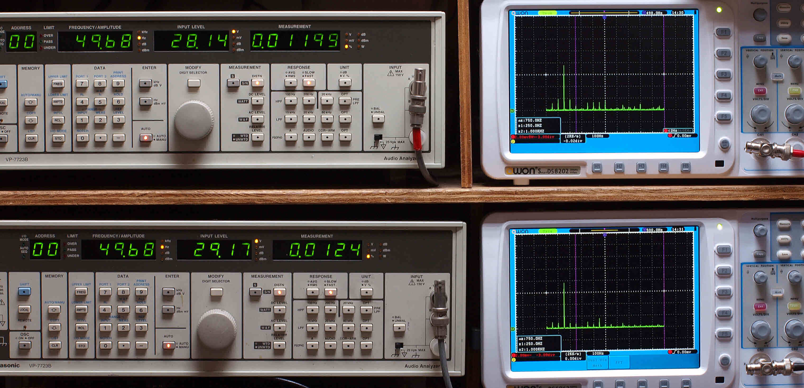 | E. 調整・測定。 画像をクリックすると、大きく(横幅2050ドット)表示されます。 E0. 出力・歪み率測定・調整 「見方」。 上段中 右側SP出力を「Audio Analyzer Panasonic VP−7723B」により測定。 表示LED、 左端=メモリーNo、 中左=周波数測定、 中右=出力電圧測定、 右端=歪み率測定。 上段右端 VP−7723Bの基本波除去出力を「owon SDS8202(200MHZ)」で「FFT分析」表示。 下段中 左側SP出力を「Audio Analyzer Panasonic VP−7723B」により測定。 表示LED、 左端=メモリーNo、 中左=周波数測定、 中右=出力電圧測定、 右端=歪み率測定。 下段右端 VP−7723Bの基本波除去出力を「owon SDS6062(200MHZ)」で「FFT分析」表示。 下段左端 オーディオ発振器 VP−7201A より50Hz〜100kHzの信号を出し(歪み率=約0.003%)、ATT+分配器を通し、AMPに入力。 よって、ダイアル設定出力レベルより低くなります。測定機器の仕様や整備の様子はこちら、「VP−7723B」「VP−7201A」。 FFT画面の見方はこちら。 |
