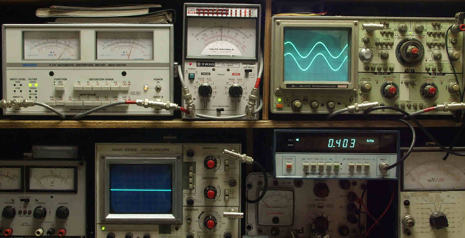 | E. 調整・測定 E1. 出力/歪み率測定・調整 <見方> 上左オーディオ発振器より400HZ・1KHZの信号を出す(歪み率=約0.003%) 下中=入力波形(オーディオ発振器のTTLレベル) 下右=周波数計 上左=SP出力の歪み率測定 左メータ=L出力、右メータ=R出力 上中=SP出力電圧測定器、赤針=R出力、黒針=L出力 上右=SP出力波形オシロ 上=R出力、下=L出力(出力電圧測定器の出力) |