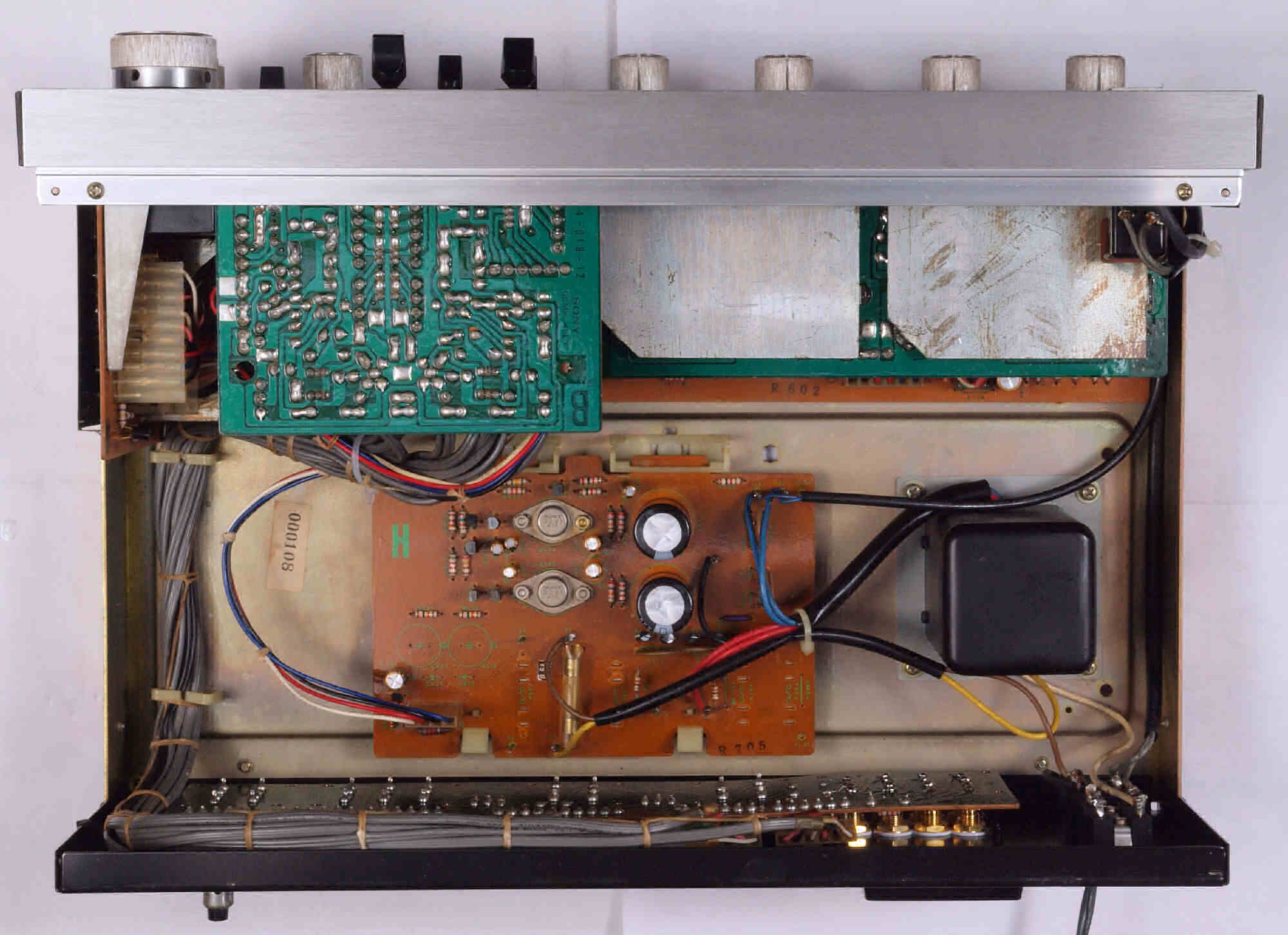 FET(電界効果トランジスター)、電解コンデンサー4個、半固定VR2個、フイルムコンデンサー2個交換。