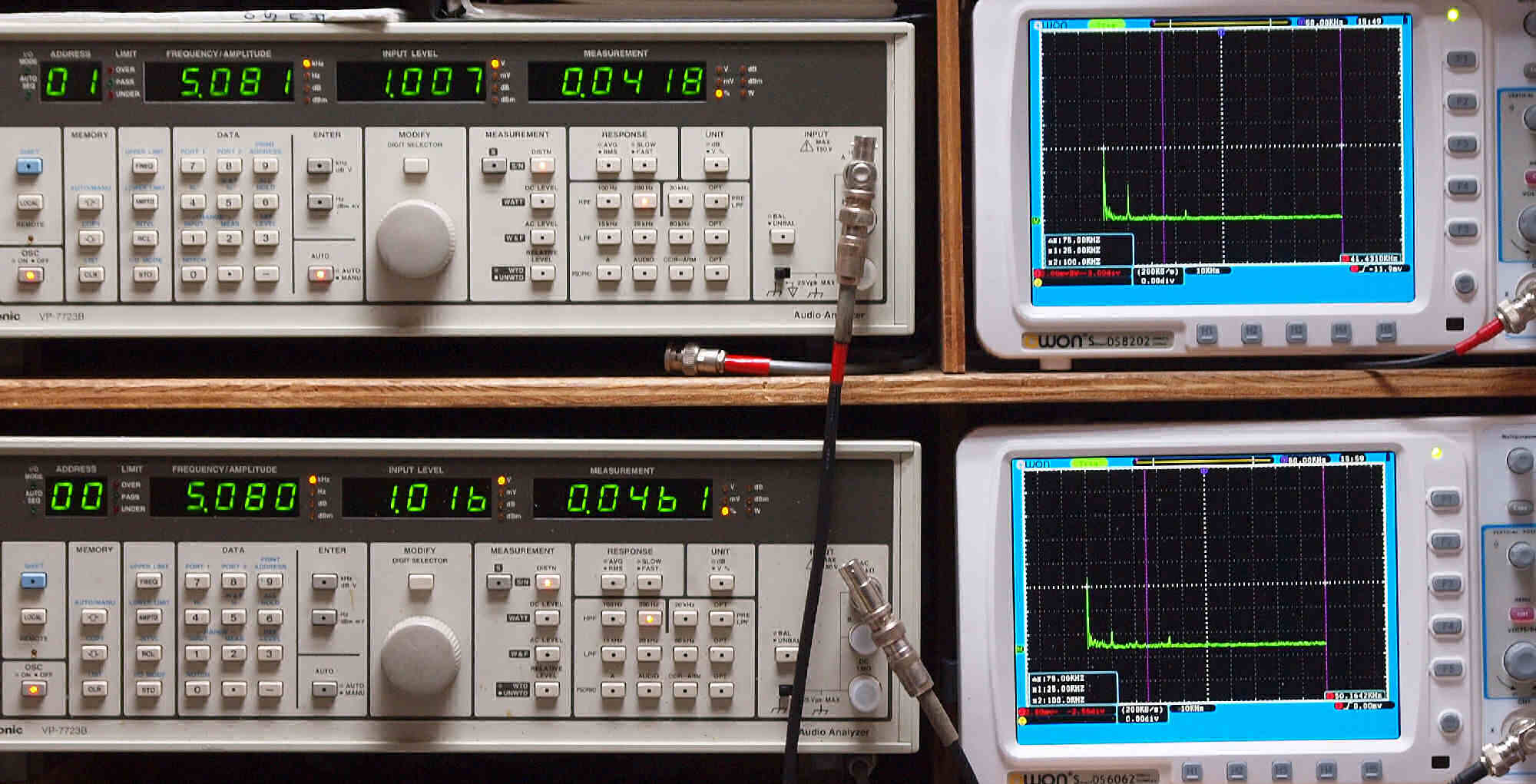 上段右端 VP−7723Bの基本波除去出力を「owon SDS8202(200MHZ)」で「FFT分析」表示。