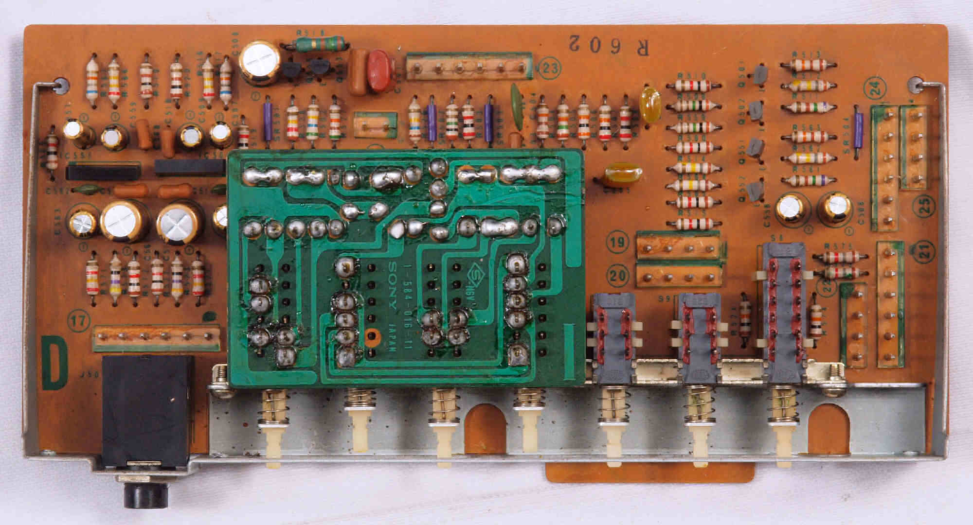 C52. 修理後 テープモニター・ファンクションSW基板 FET(電界効果トランジスター)2個、電解コンデンサー6個交換。
