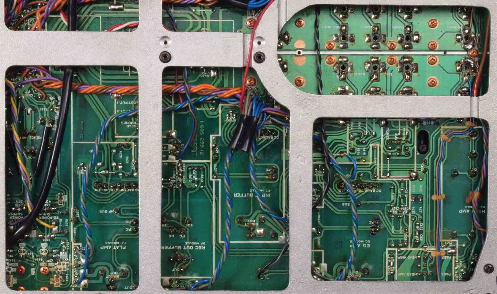 A32. 点検中 入出力RCA端子郡は基板に直付けされている。基板裏に回路があり、間隔も狭いので交換不可。