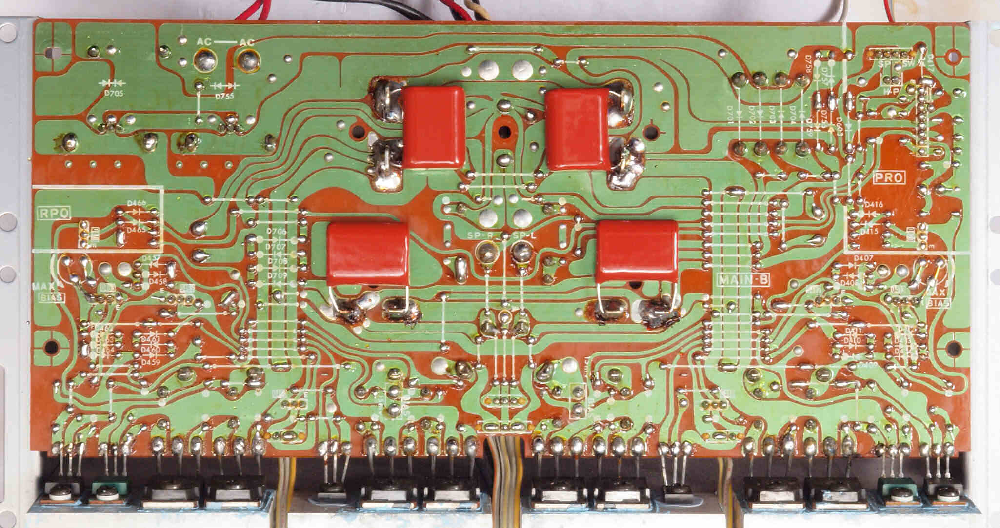 C14. 修理(半田補正)後 POWER AMP−B基板裏、 全ての半田をやり修す。フイルムコンデンサー4個追加。