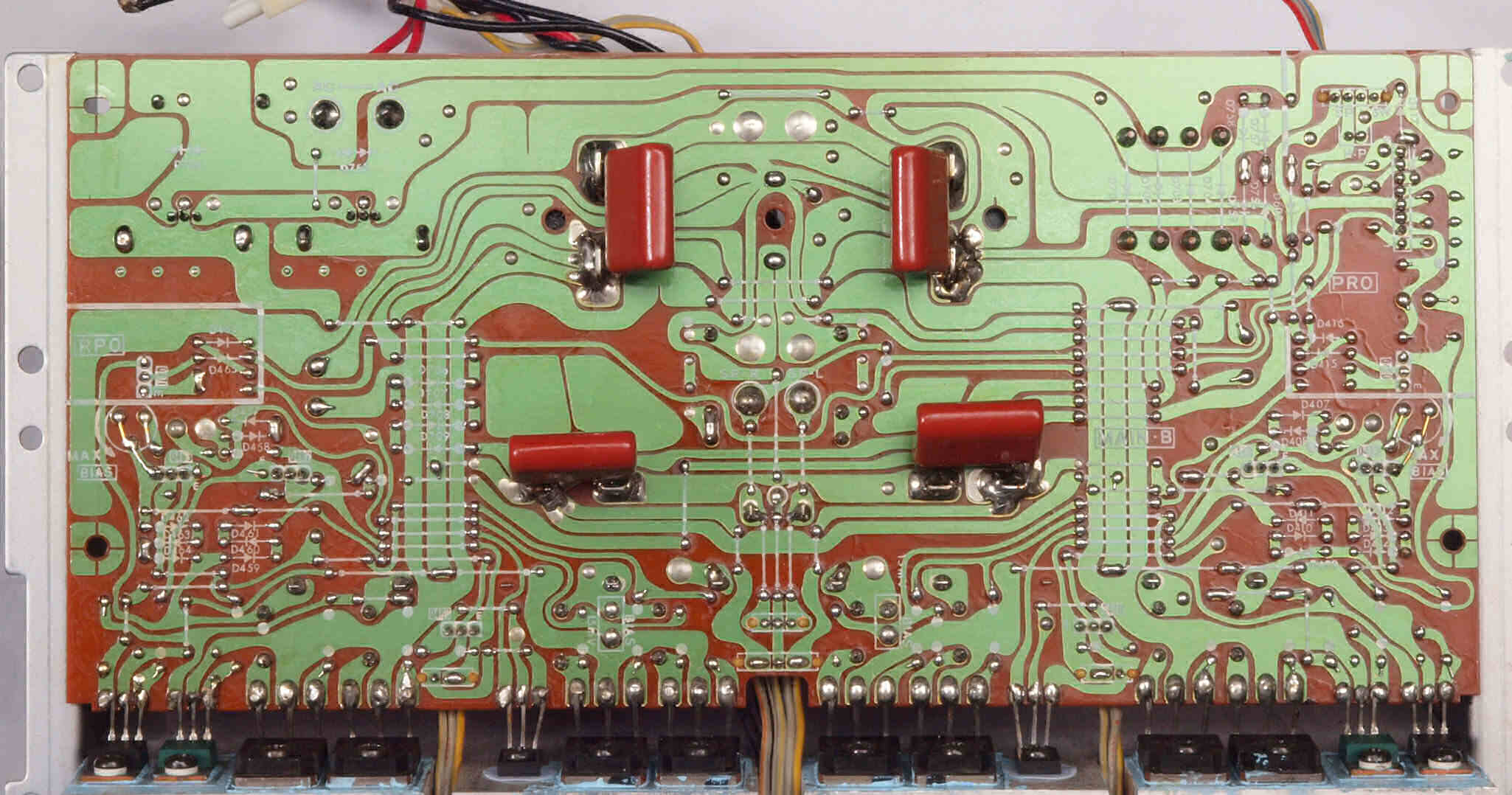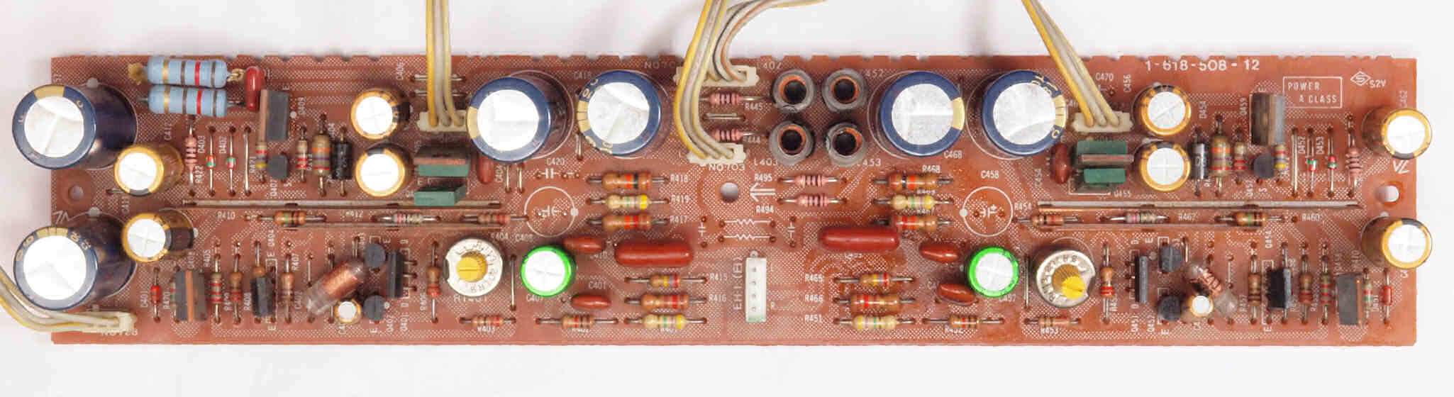 C22. 修理後 POWER AMP−A基板 複合TR(トランジスター)2個、電解コンデンサ−20個、半固定VR2個、ヒューズ抵抗8個交換。