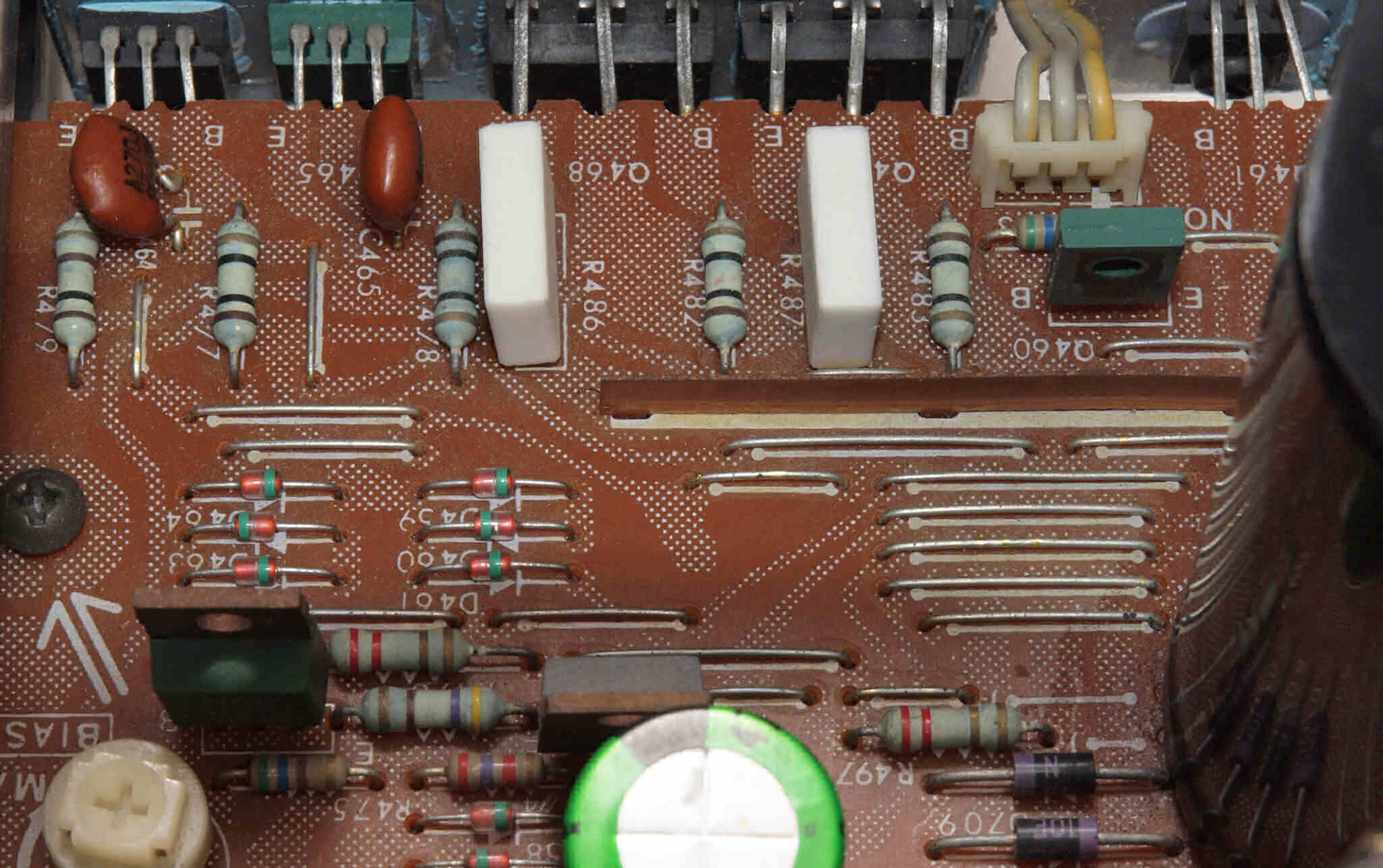 A19. 点検中 終段AMP基板。 右側ヒューズ入抵抗は全滅。