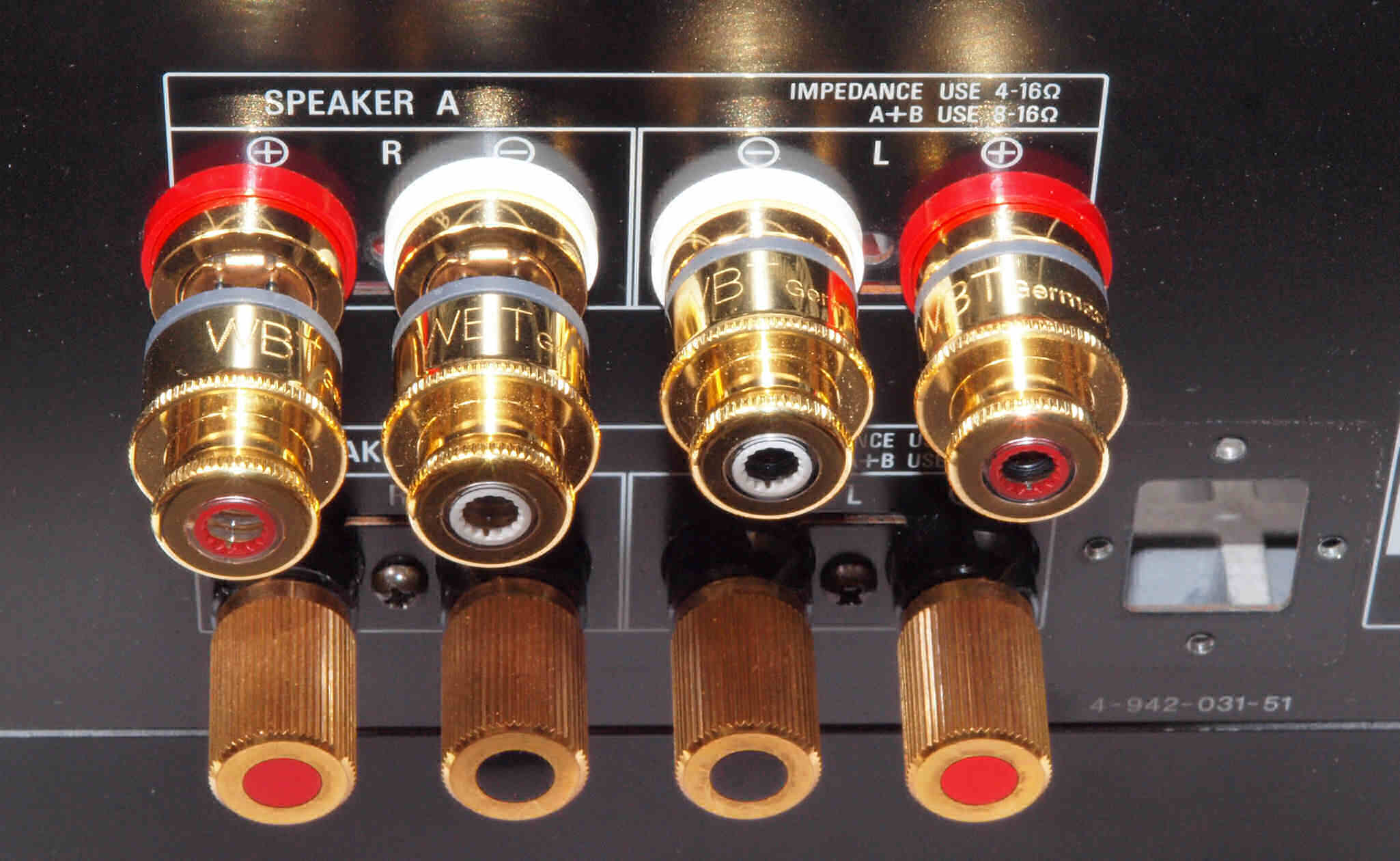 | A42. 点検中 SP接続端子。取り付け穴が大きいので、WBT−0705Cuに2組交換可能、今回1組交換。 | ||||||||||||||||||||||||||||||||||||