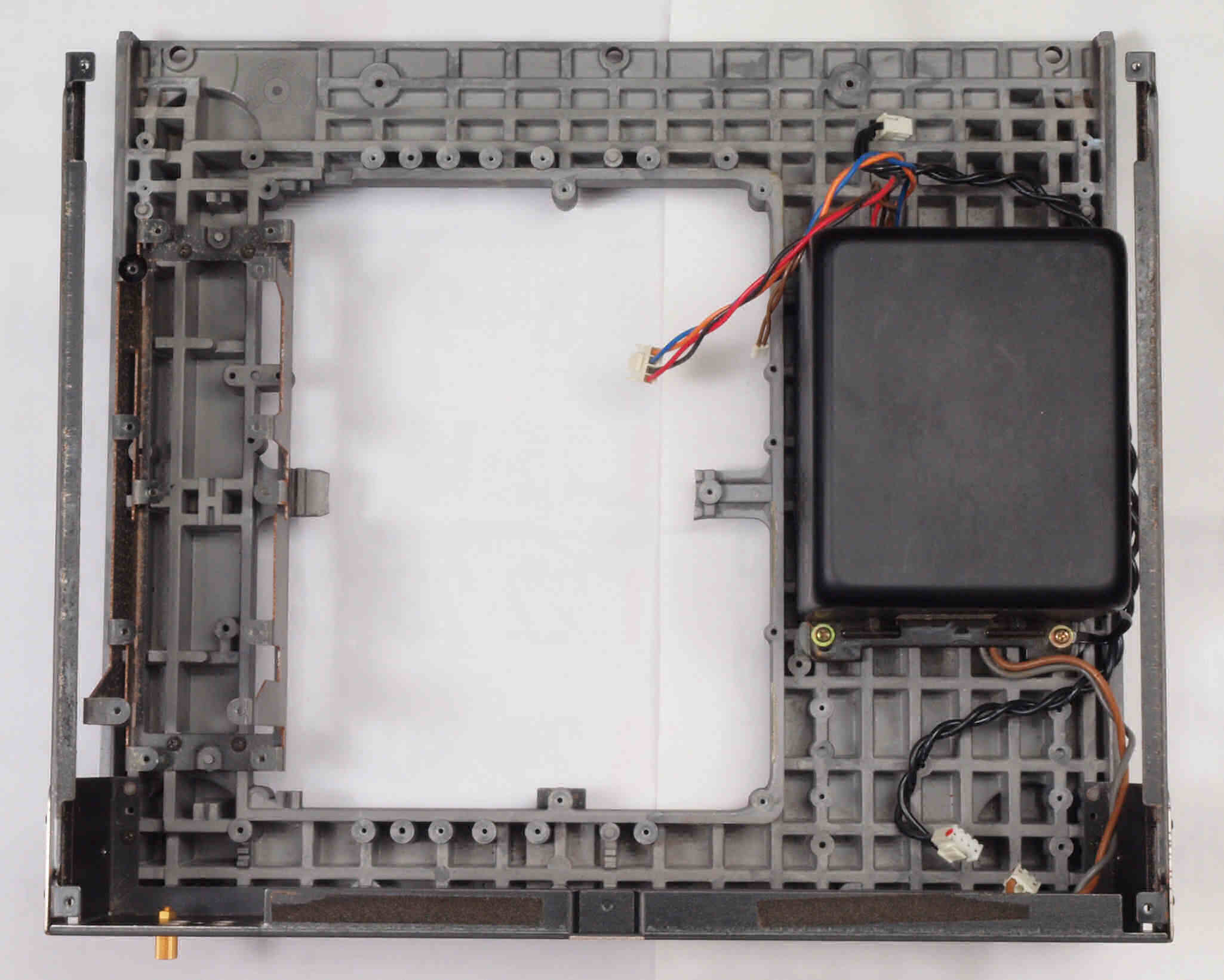 | C. 修理状況。 画像をクリックすると、大きく(横幅2050ドット)表示されます。 C1. 修理中 前パネル、基板を外したアコースティカリーチューンドGシャーシ(Acoustically Tuned Gibraltar Chassis)。 |