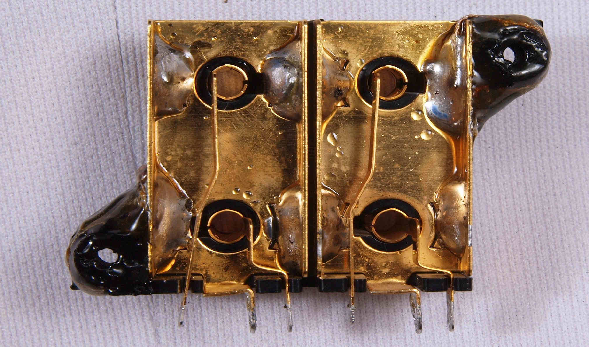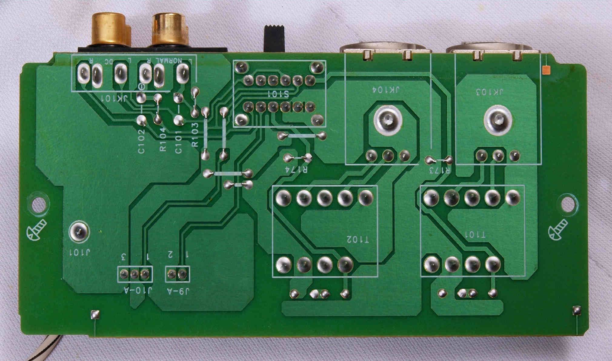 C114. 修理後 入力端子基板のRCA端子裏側、さらにホットボンドで補強。