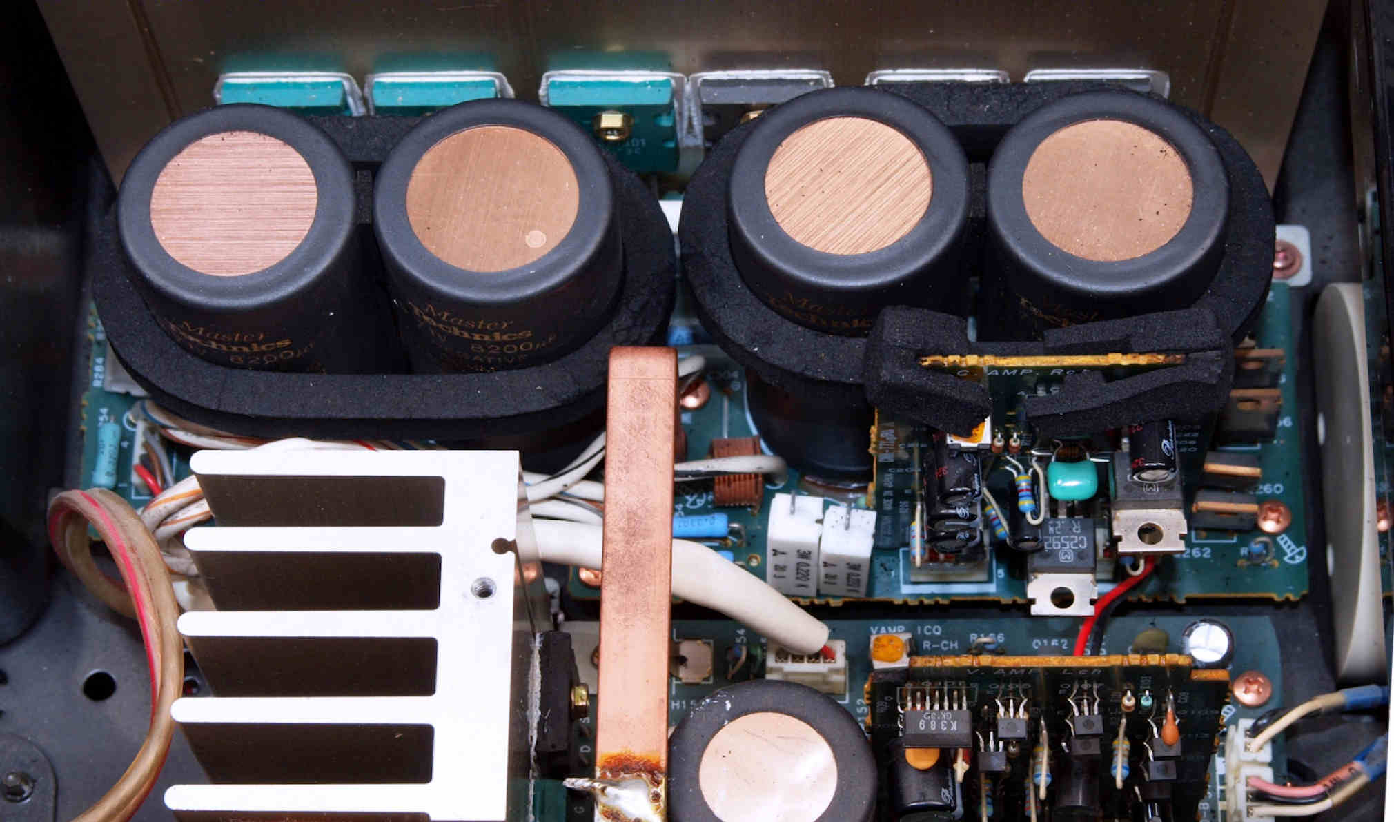 A52. 点検中 左AMP部の大型電解コンデンサーのゴム鉢巻はボロボロ!