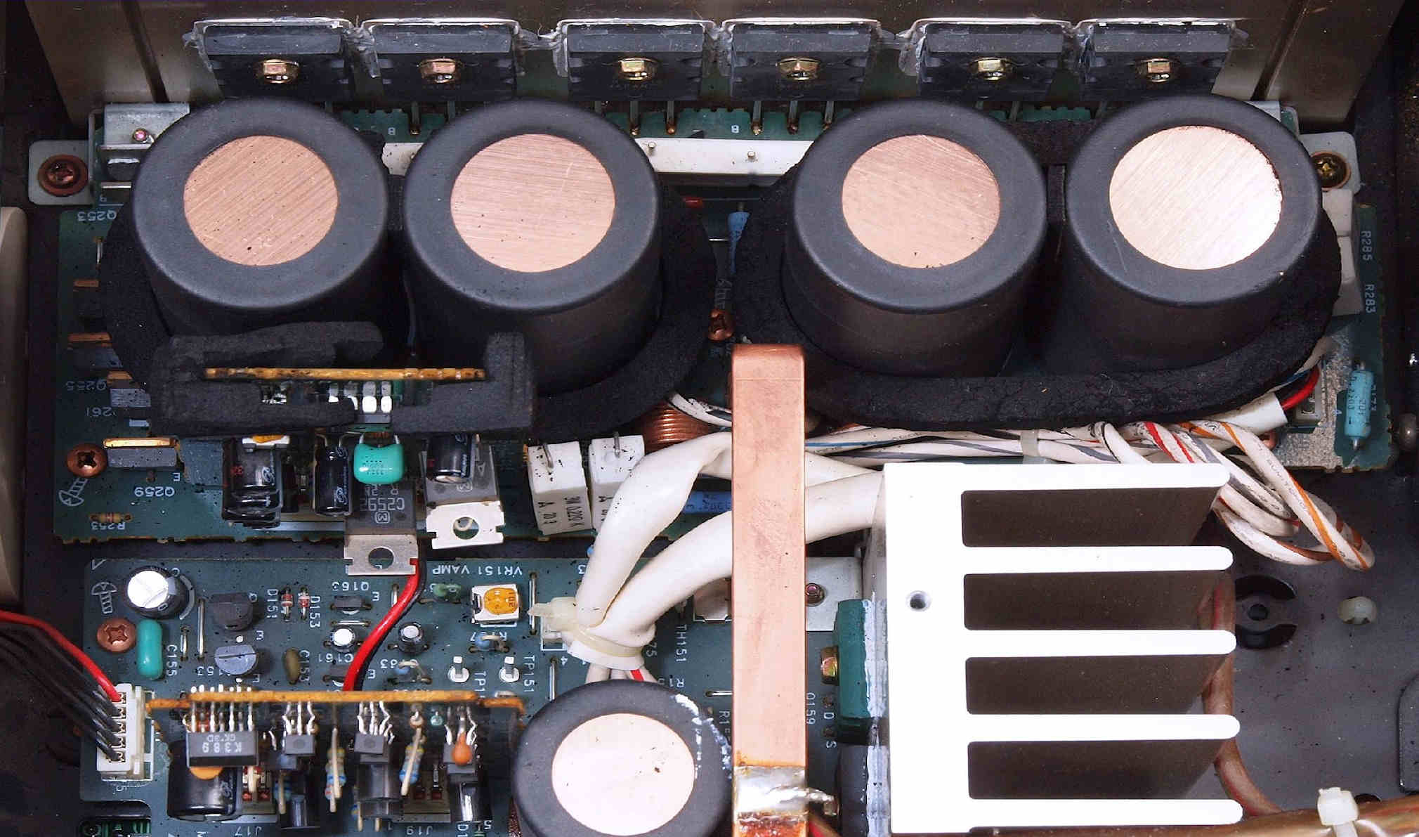 A51. 点検中 右AMP部の大型電解コンデンサーのゴム鉢巻はボロボロ!