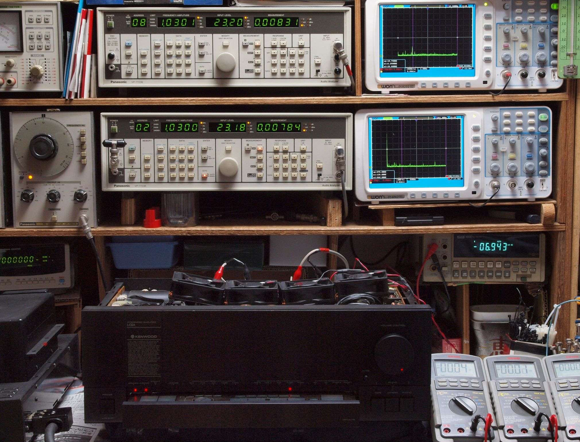 | E. 測定・調整。 画像をクリックすると、大きく(横幅2050ドット)表示されます。 E1. 出力・歪み率測定・調整 「見方」。 上段中 右側SP出力を「Audio Analyzer Panasonic VP−7723B」により測定。 表示LED、 左端=メモリーNo、 中左=周波数測定、 中右=出力電圧測定、 右端=歪み率測定。 上段右端 VP−7723Bの基本波除去出力を「owon SDS8202(200MHZ)」で「FFT分析」表示。 下段中 左側SP出力を「Audio Analyzer Panasonic VP−7723B」により測定。 表示LED、 左端=メモリーNo、 中左=周波数測定、 中右=出力電圧測定、 右端=歪み率測定。 下段右端 VP−7723Bの基本波除去出力を「owon SDS6062(200MHZ)」で「FFT分析」表示。 下段左端 オーディオ発振器 VP−7201A より50Hz〜100kHzの信号を出し(歪み率=約0.003%)、ATT+分配器を通し、AMPに入力。 よって、ダイアル設定出力レベルより低くなります。測定機器の仕様や整備の様子はこちら、「VP−7723B」「VP−7201A」。 FFT画面の見方はこちら。 |