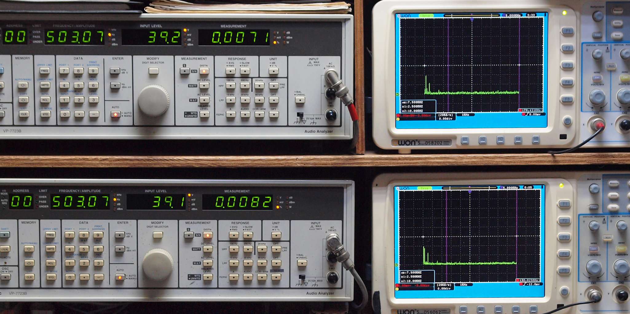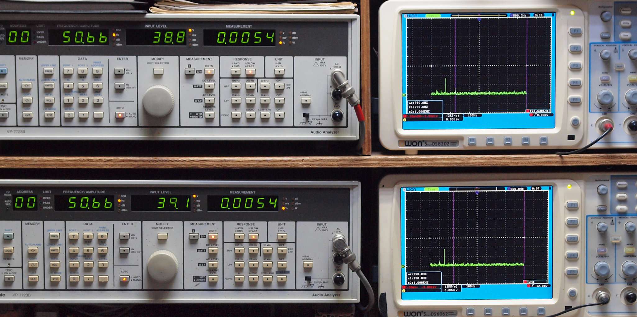 | E. 測定・調整。 画像をクリックすると、大きく(横幅2050ドット)表示されます。 E0. 出力・歪み率測定・調整 「見方」。 上段中 右側SP出力を「Audio Analyzer Panasonic VP−7723B」により測定。 表示LED、 左端=メモリーNo、 中左=周波数測定、 中右=出力電圧測定、 右端=歪み率測定。 上段右端 VP−7723Bの基本波除去出力を「owon SDS8202(200MHZ)」で「FFT分析」表示。 下段中 左側SP出力を「Audio Analyzer Panasonic VP−7723B」により測定。 表示LED、 左端=メモリーNo、 中左=周波数測定、 中右=出力電圧測定、 右端=歪み率測定。 下段右端 VP−7723Bの基本波除去出力を「owon SDS6062(200MHZ)」で「FFT分析」表示。 下段左端 オーディオ発振器 VP−7201A より50Hz〜100kHzの信号を出し(歪み率=約0.003%)、ATT+分配器を通し、AMPに入力。 よって、ダイアル設定出力レベルより低くなります。測定機器の仕様や整備の様子はこちら、「VP−7723B」「VP−7201A」。 FFT画面の見方はこちら。 |