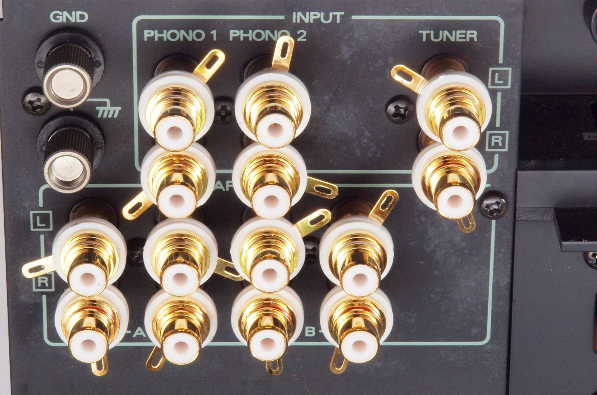 | C6A. 修理(交換)後 入出力 RCA端子郡。 RCA端子(テフロン絶縁)5組10個交換、PHONO-1とTUNERをWBT−0201に交換。 |