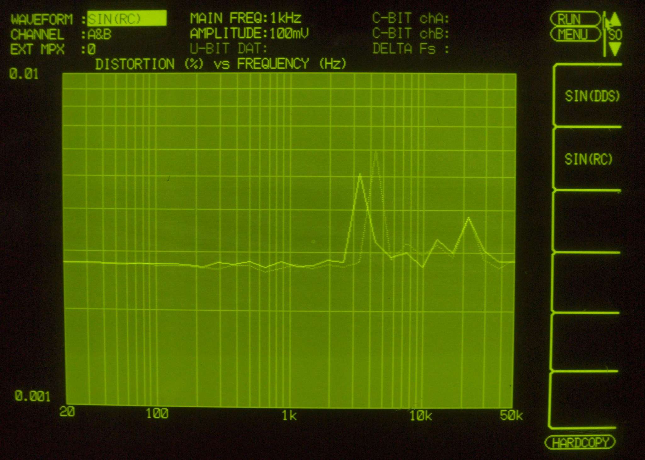 | E45. MC_5kHz入力、R側出力電圧=2V、 0.00679%歪み。 L側出力電圧=2V、 0.00684%歪み。 「FFT分析」のオシロのカーソル周波数、左=25kHz、右=100kHz。 |