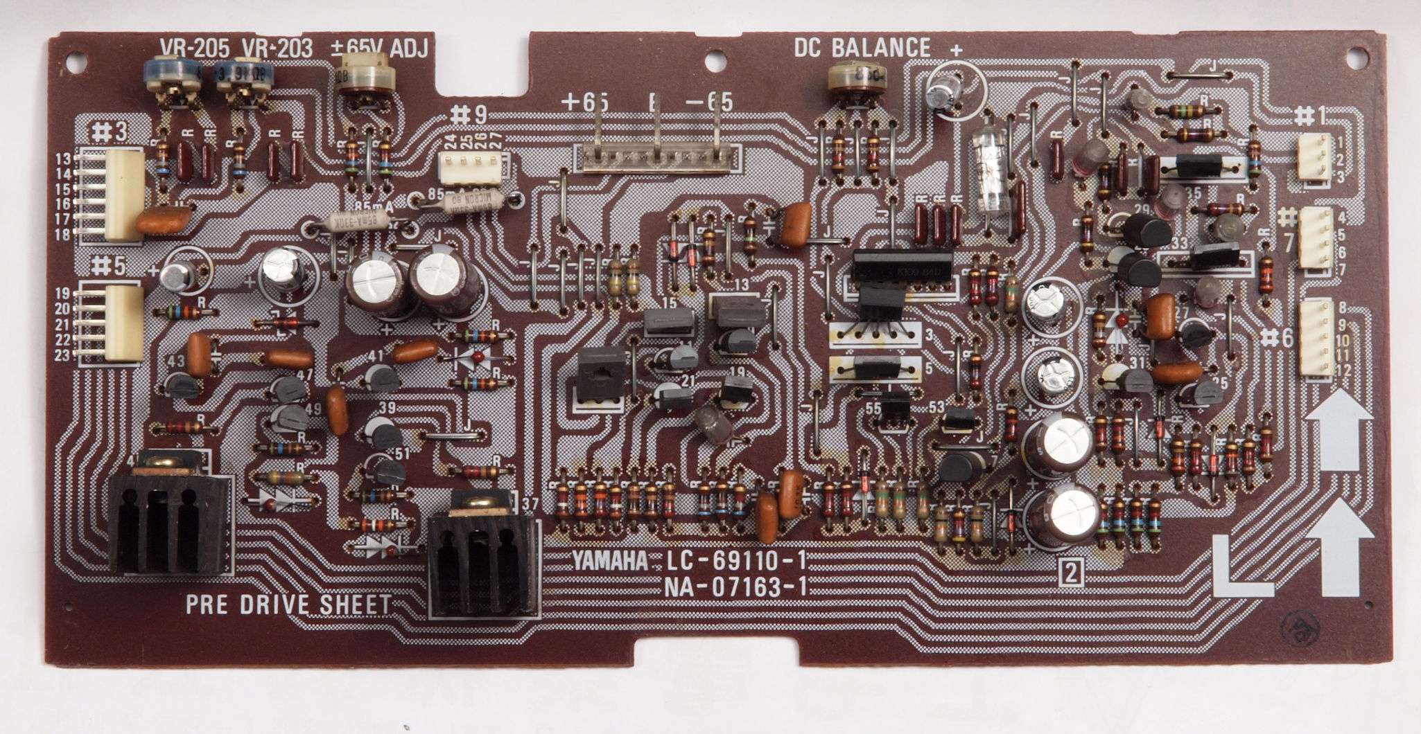 C22. 修理後 L側-AMP基板 半固定VR4個、電解コンデンサー9個、FET(Field Effect Transistor)3個交換
