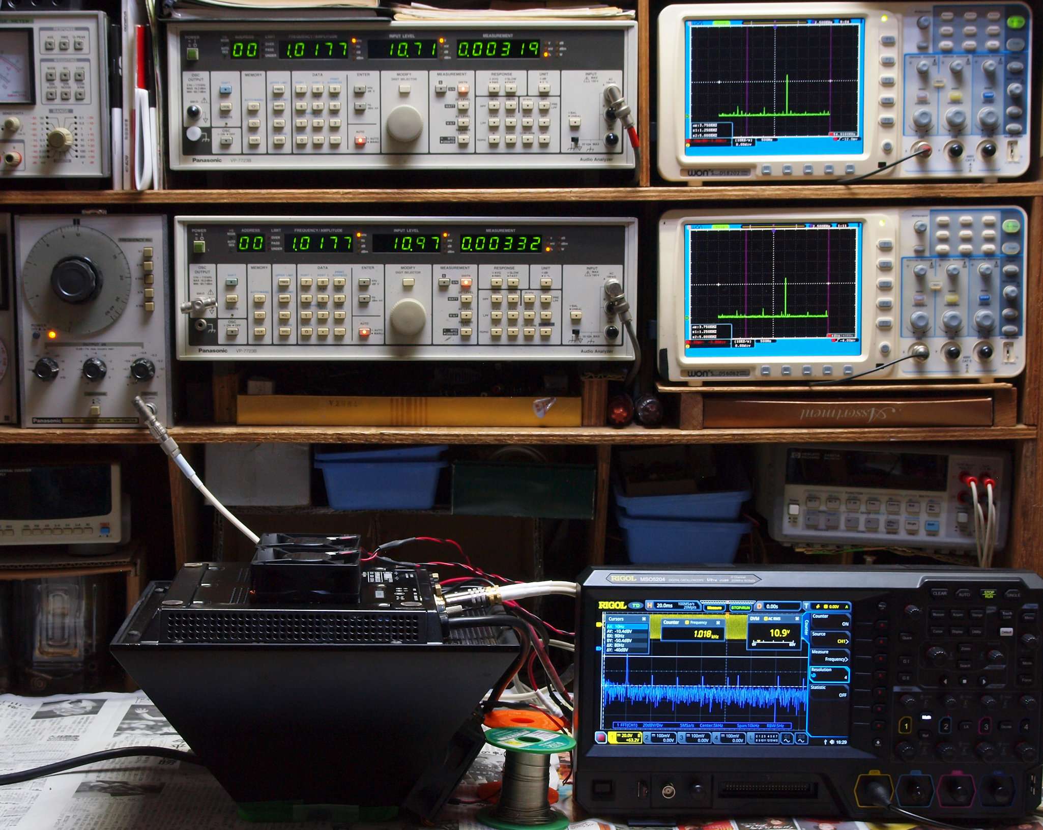 | E. 測定・調整。 画像をクリックすると、大きく(横幅2050ドット)表示されます。 E0. 出力・歪み率測定・調整 「見方」。 中=SP出力を「Audio Analyzer Panasonic VP−7723B」により測定。 表示LED、 左端=メモリーNo、 中左=周波数測定、 中右=出力電圧測定、 右端=歪み率測定。 右端=VP−7723Bの基本波除去出力を「owon SDS8202(200MHZ)」で「FFT分析」表示。 左端=オーディオ発振器 VP−7201A より50Hz〜100kHzの信号を出し(歪み率=約0.003%)、ATT+分配器を通し、AMPに入力。 よって、ダイアル設定出力レベルより低くなります。測定機器の仕様や整備の様子はこちら、「VP−7723B」「VP−7201A」。 FFT画面の見方はこちら。 |