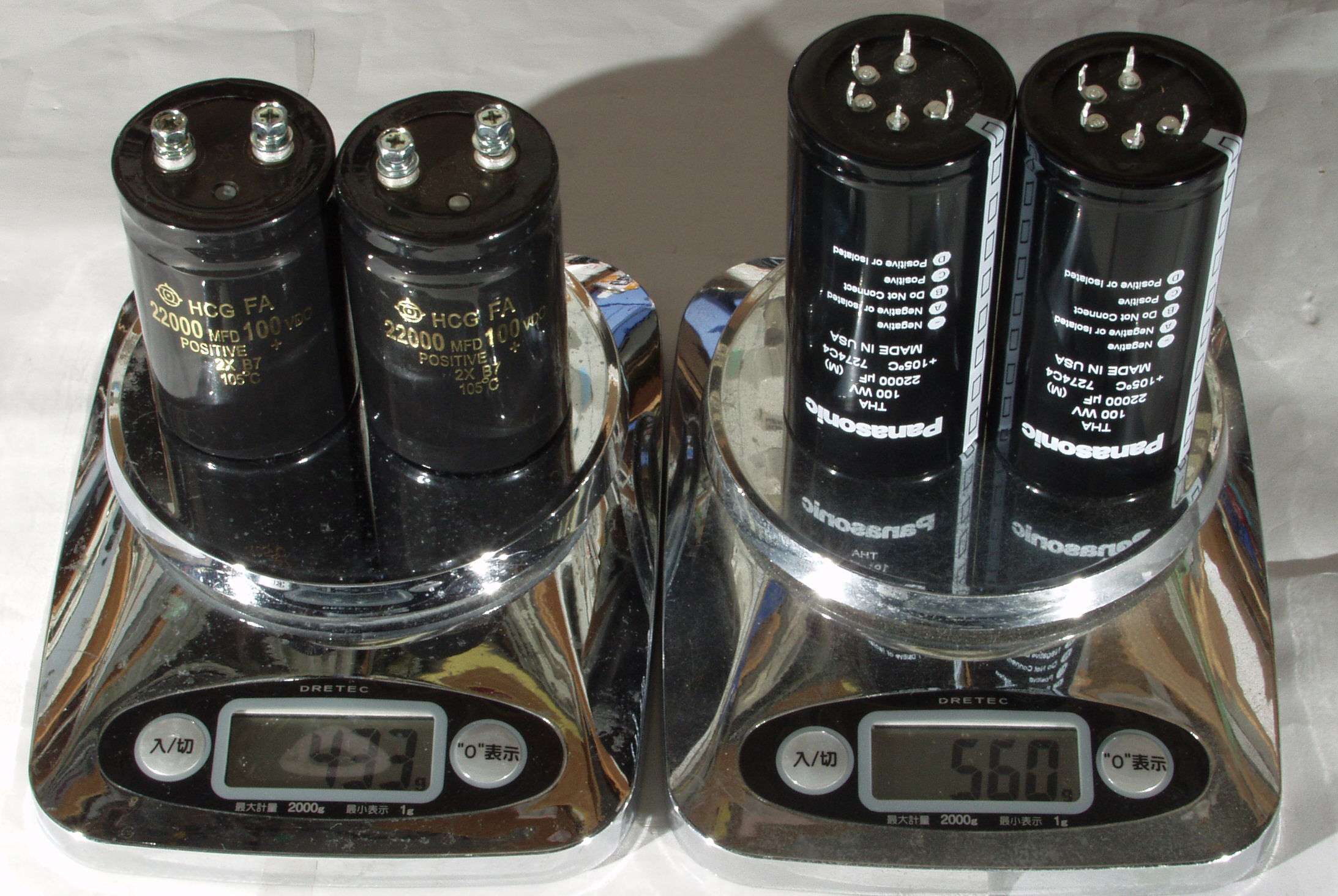 | A31. 重量測定。右=日立 15000μ/100V。 2本、左=Panasonic 22000μ/100V 2本で560g | ||||||||||||||||||||||||||||||||||||||||||||||||||||||||||||||||