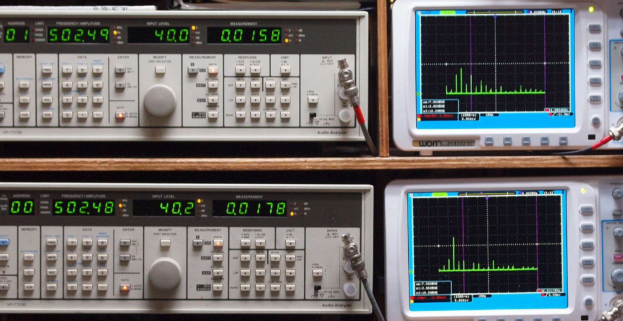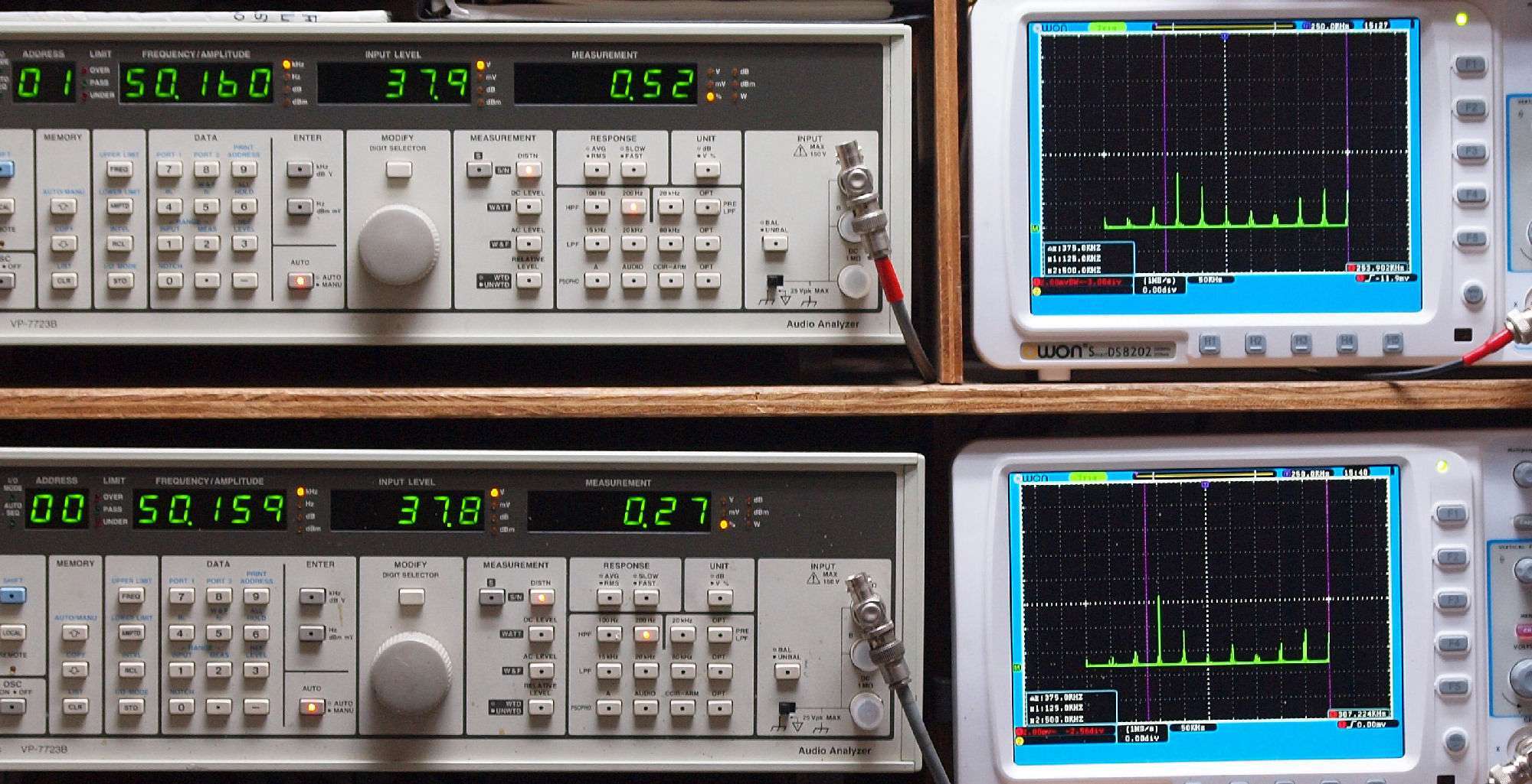 | E. 測定・調整 E1. 出力・歪み率測定・調整 「見方」。 上段中 右側SP出力を「Audio Analyzer Panasonic VP−7723B」により測定。 表示LED、 左端=メモリーNo、 中左=周波数測定、 中右=出力電圧測定、 右端=歪み率測定。 上段右端 VP−7723Bの基本波除去出力を「owon SDS8202(200MHZ)」で「FFT分析」表示。 下段中 左側SP出力を「Audio Analyzer Panasonic VP−7723B」により測定。 表示LED、 左端=メモリーNo、 中左=周波数測定、 中右=出力電圧測定、 右端=歪み率測定。 下段右端 VP−7723Bの基本波除去出力を「owon SDS6062(200MHZ)」で「FFT分析」表示。 下段左端 オーディオ発振器 VP−7201A より50Hz〜100kHzの信号を出し(歪み率=約0.003%)、ATT+分配器を通し、AMPに入力。 よって、ダイアル設定出力レベルより低くなります。測定機器の仕様や整備の様子はこちら、「VP−7723B」「VP−7201A」。 FFT画面の見方はこちら。 右は、AC100V入力電圧可変(スライダック)、アイドル電流設定に使用する。 |
