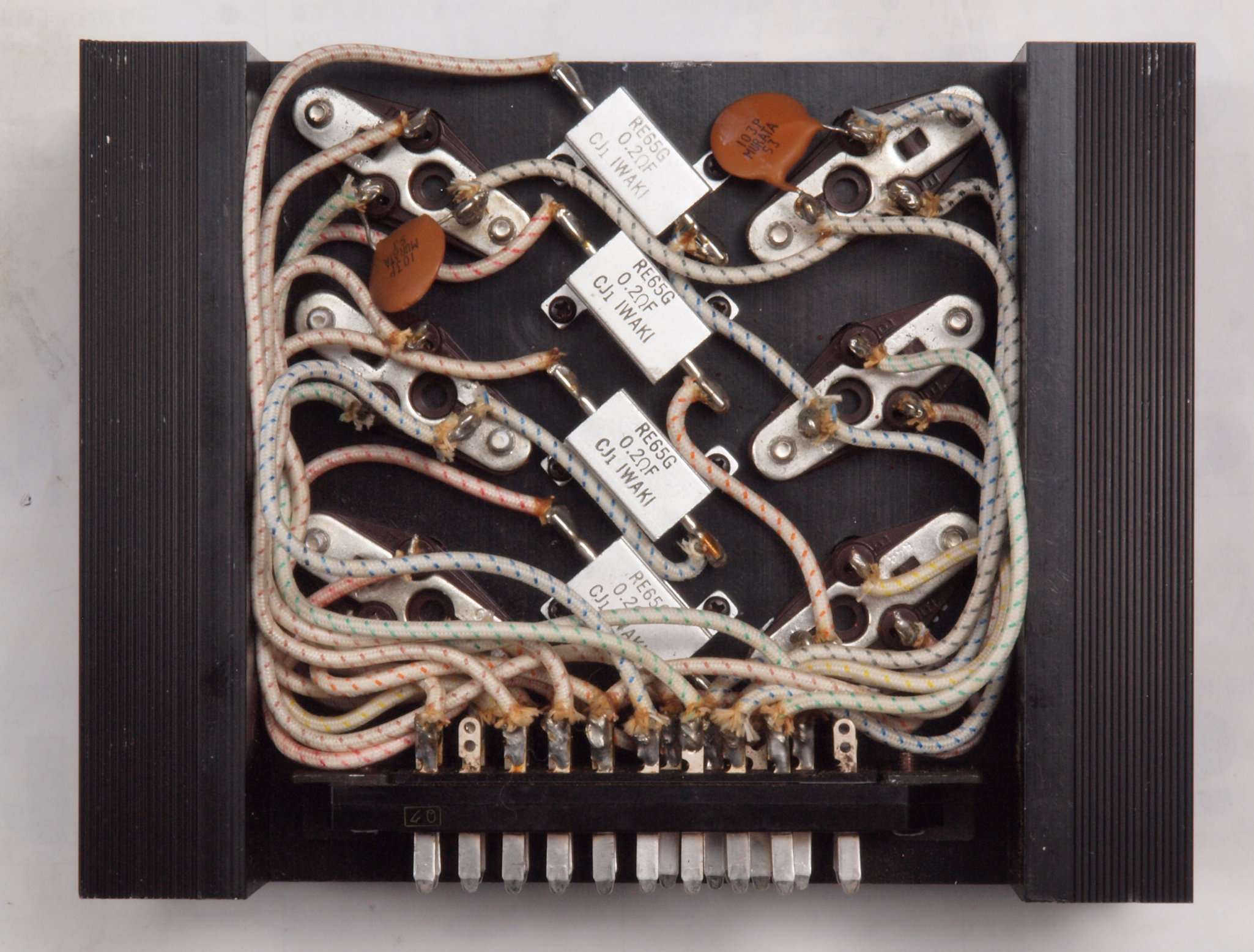 CL2. 修理後  SIT(静電誘導型トランジスター)用ブロック電解コンデンサー下周り。フイルムコンデンサー4個追加、取り付けビス2個交換。
