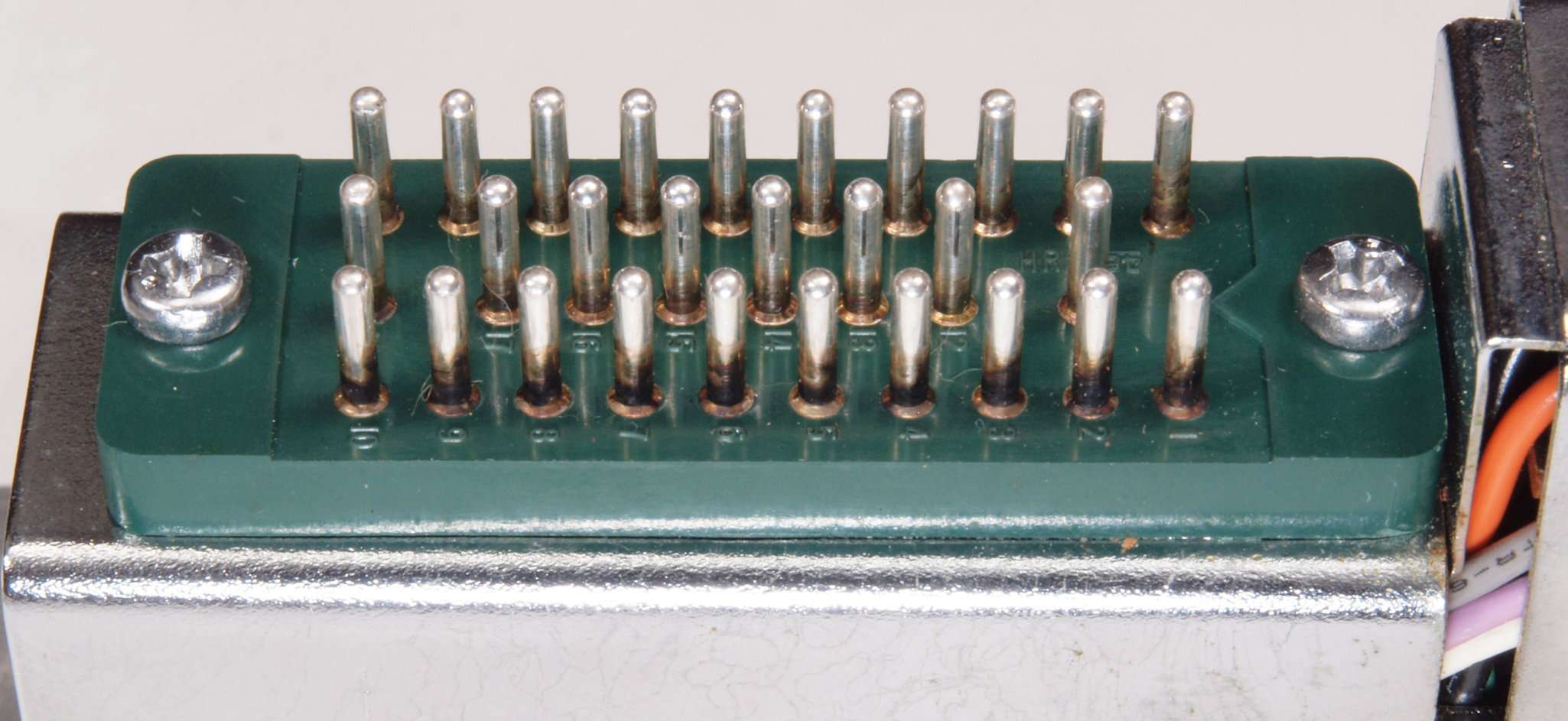 A23. 点検中、 上蓋、左右パネルを取り上から見る。右ドライブ基板カードエッジコネクター絶縁不良、 接点復活剤の塗布により炭化(接点の黒い所)が酸化されて入る。隣との端子間で270Vの電位差がある所がある。