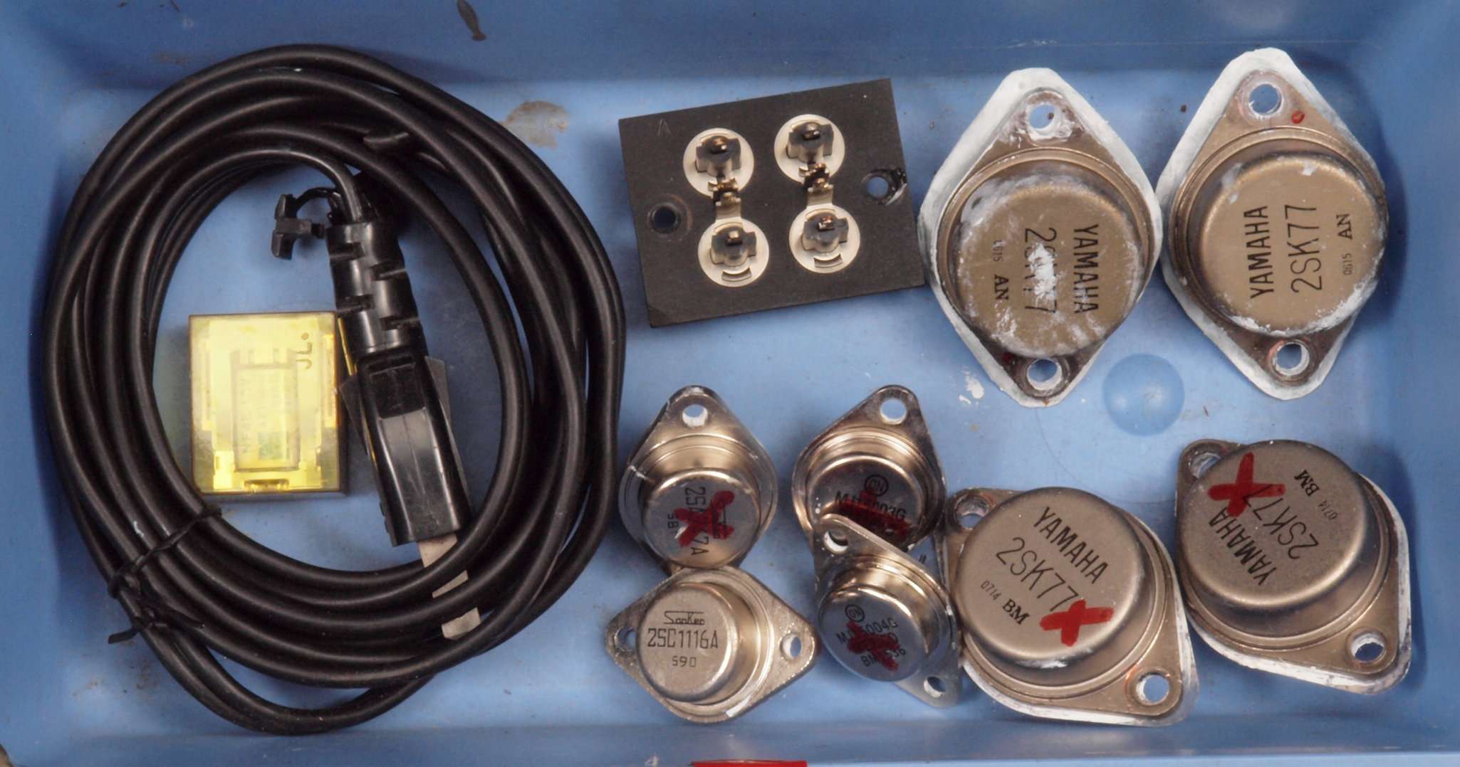 交換部品名=トランジスタ、ダイオード52個、ヒューズ、ヒートシンク6個 半固定ボリューム、抵抗11個、電解コンデンサ10個