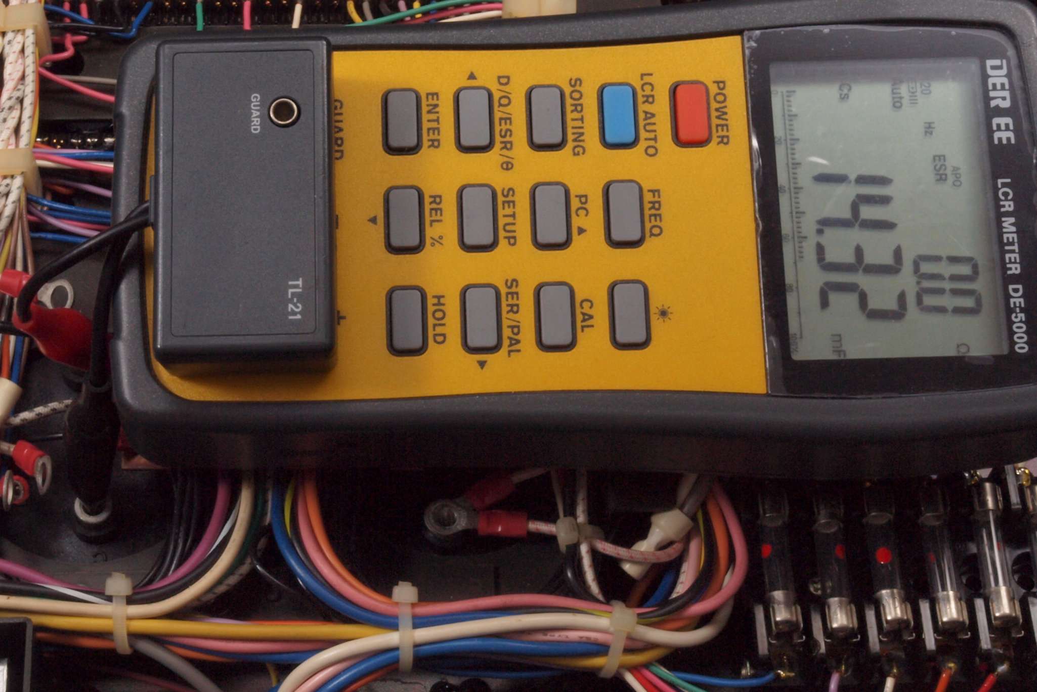 A52. 点検中、電源ブロック電解コンデンサー容量測定、 右側+側=12690μ/120HZ。