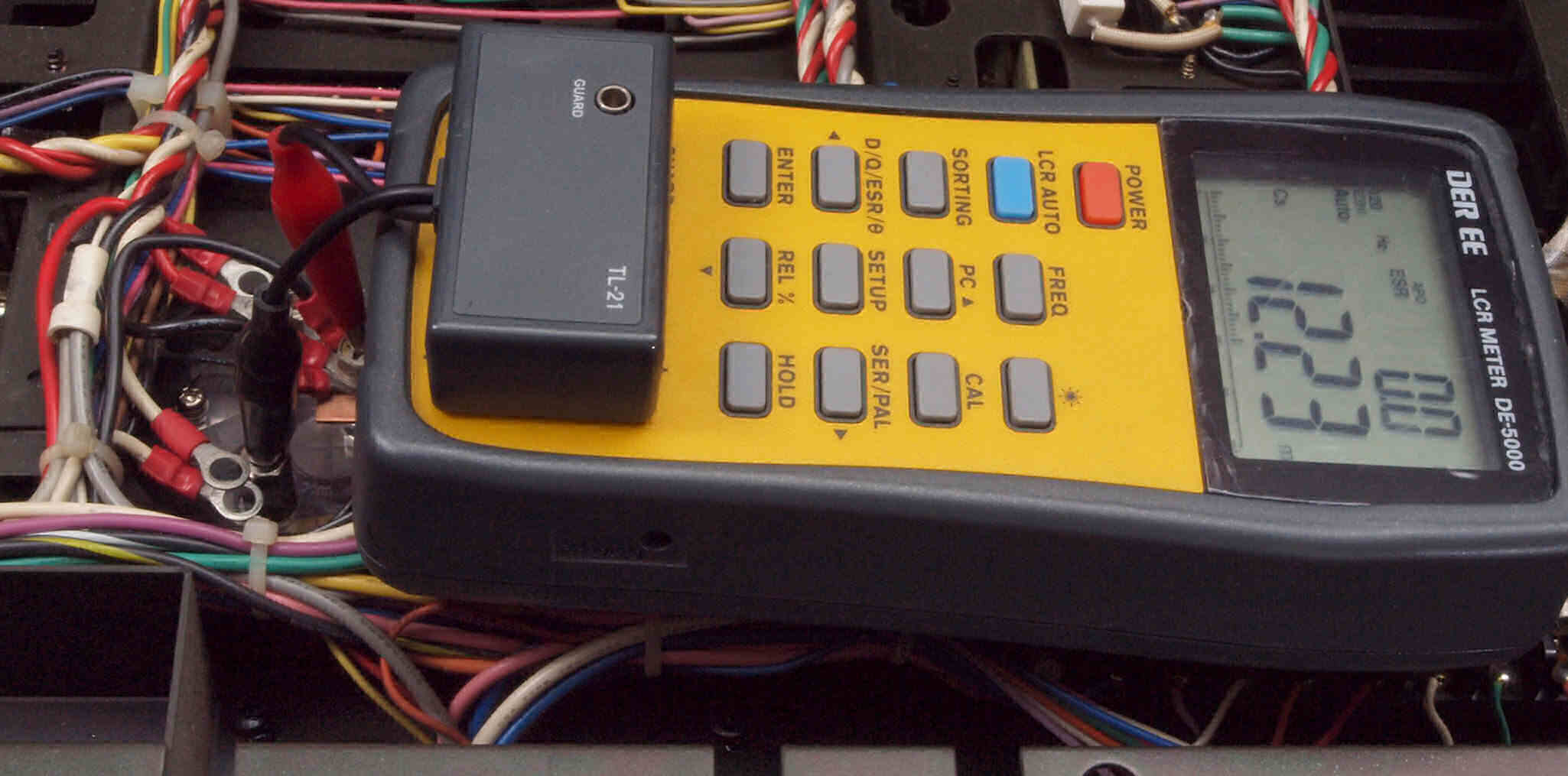 A23. 点検中、電源ブロック電解コンデンサー容量測定、 右側+側=12210μ/120HZ。