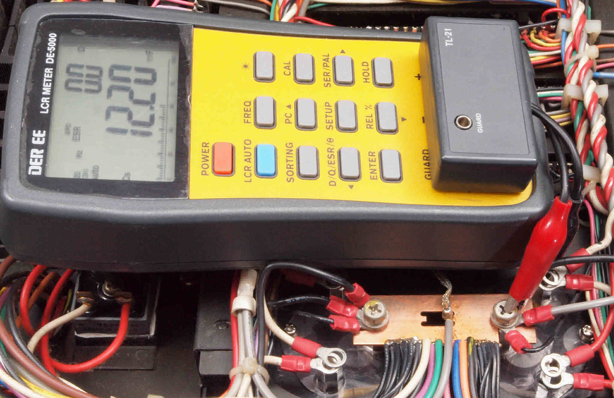A25. 点検中、電源ブロック電解コンデンサー容量測定、 左側+側=12200μ/120HZ。
