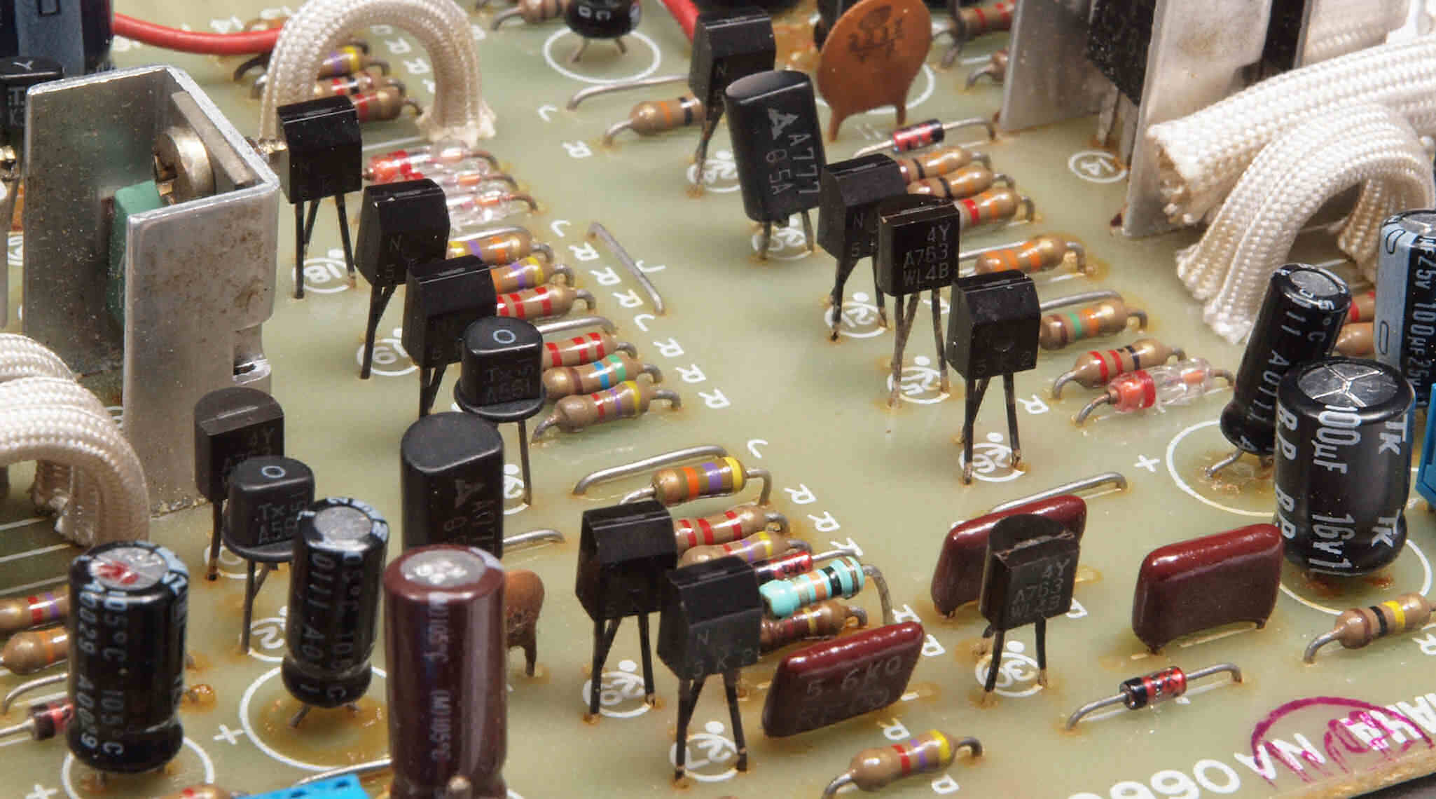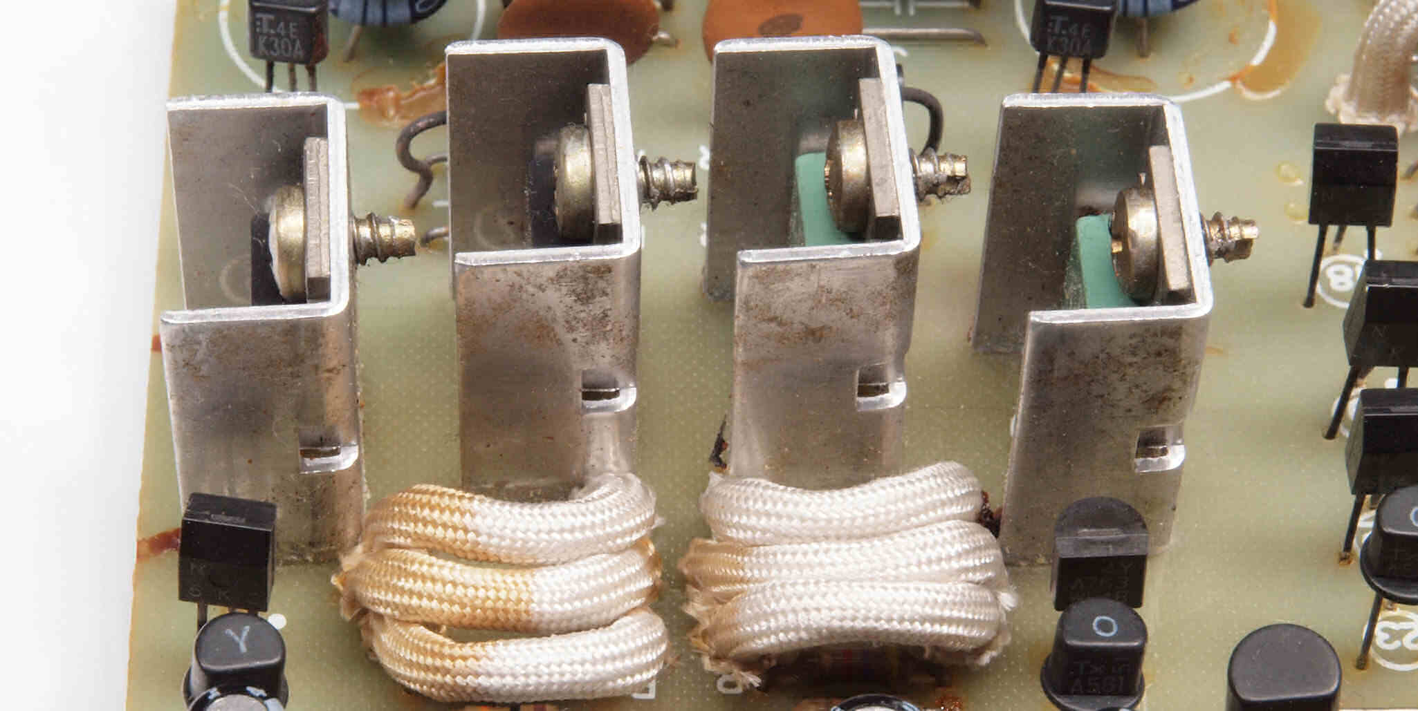 C412. 修理中 電源1基板。電解コンデンサー固定用の接着材、当時は溶媒にトルエンが使用されており、銅を腐食する。 焼損保護を被した抵抗を外して点検。