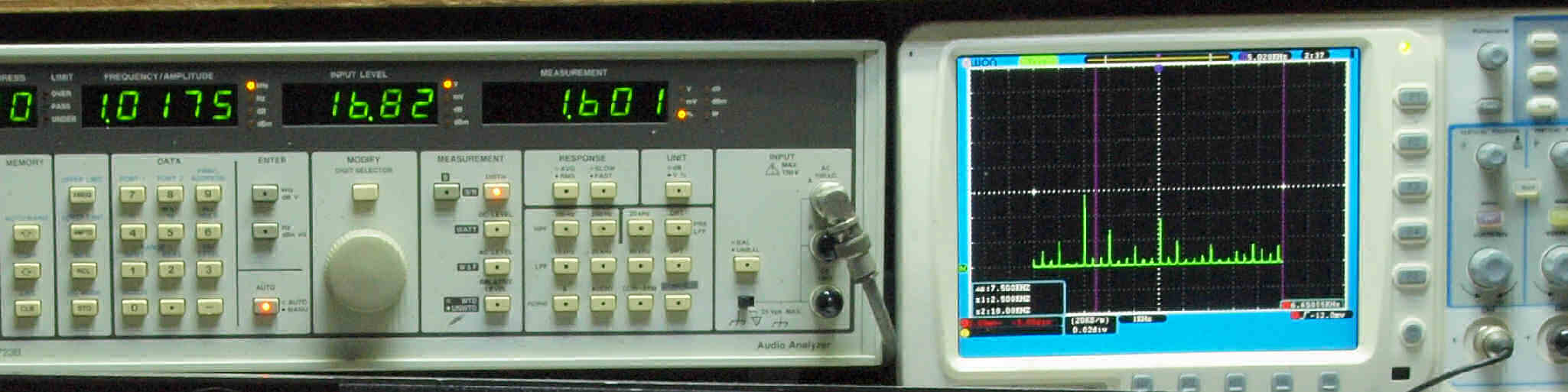 | T. バラック修理後点検測定。画像をクリックすると、大きく(横幅2050ドット)表示されます。 T0. 出力・歪み率測定・調整、 100Vで測定。 「見方」。 中 SP出力を「Audio Analyzer Panasonic VP−7723B」により測定。 表示LED、 左端=メモリーNo、 中左=周波数測定、 中右=出力電圧測定、 右端=歪み率測定。 右端 VP−7723Bの基本波除去出力を「owon SDS6062(200MHZ)」で「FFT分析」表示。 左端 オーディオ発振器 VP−7201A より50Hz〜100kHzの信号を出し(歪み率=約0.003%)、ATT+分配器を通し、AMPに入力。 よって、ダイアル設定出力レベルより低くなります。測定機器の仕様や整備の様子はこちら、「VP−7723B」「VP−7201A」。 FFT画面の見方はこちら。 |