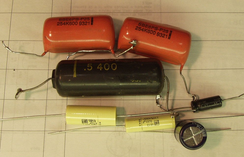 下の白い筒状のが交換する、メタライズド・フイルム・コンデンサー