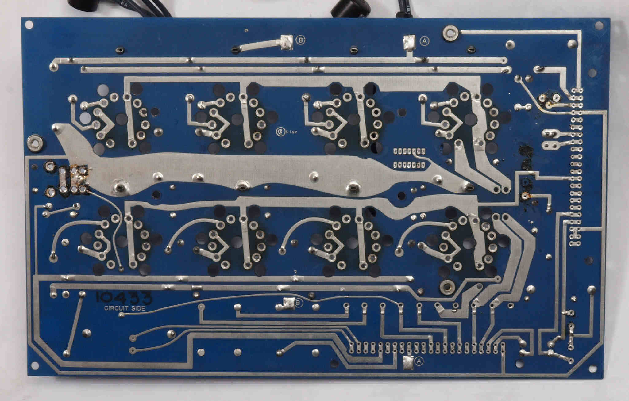 | C113. 修理中 終段6LF6基板。エッジコネクター端子取り付け部の接点復活材跡、1部緑青が発生している。 | ||||||||||||||||||||||