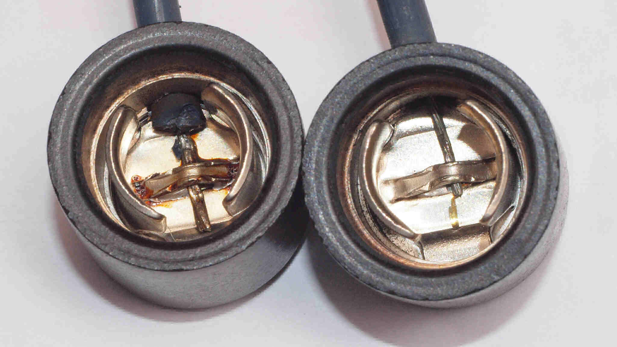 | A42. 点検中 強力な接点復活材を使用したので真空管足に緑青が発生、拡大。左からECC83、6FS5 2本。 | ||||||||||||||||||||||